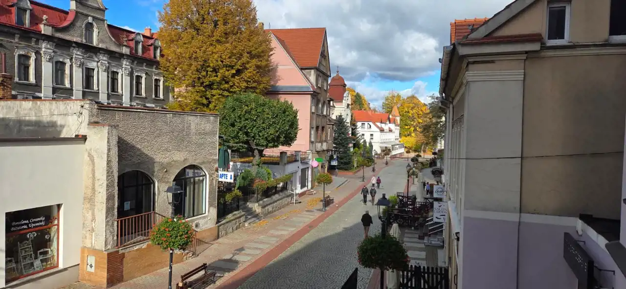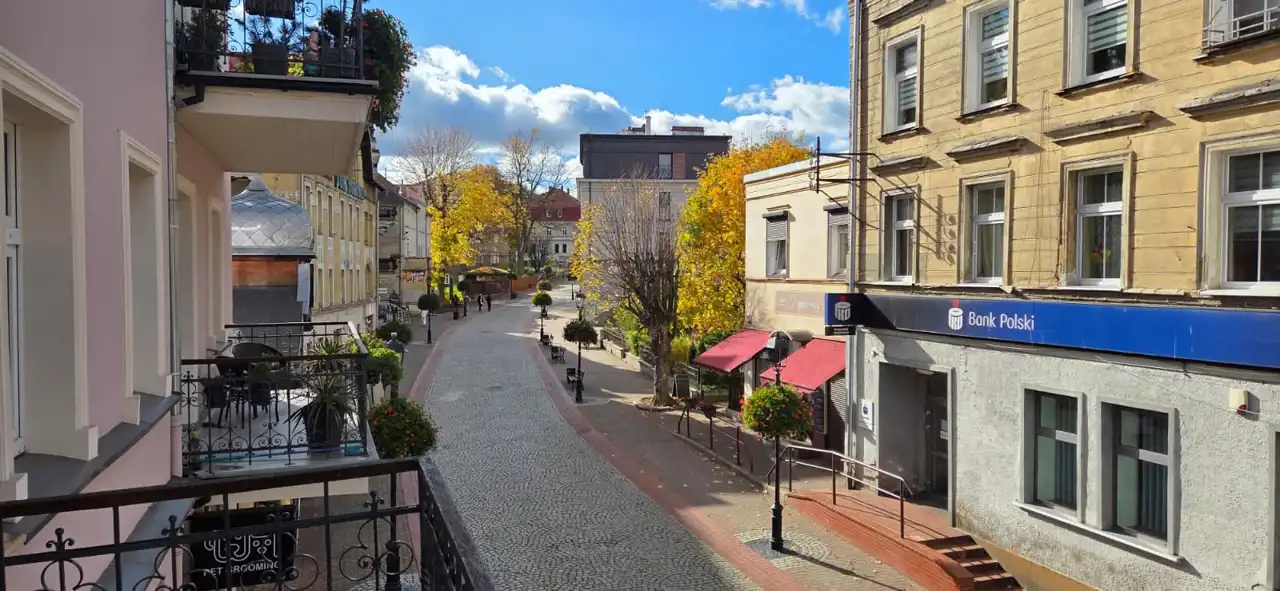 balkonu z uroczym widokiem na główny bulwar Szczawna-Zdroju.