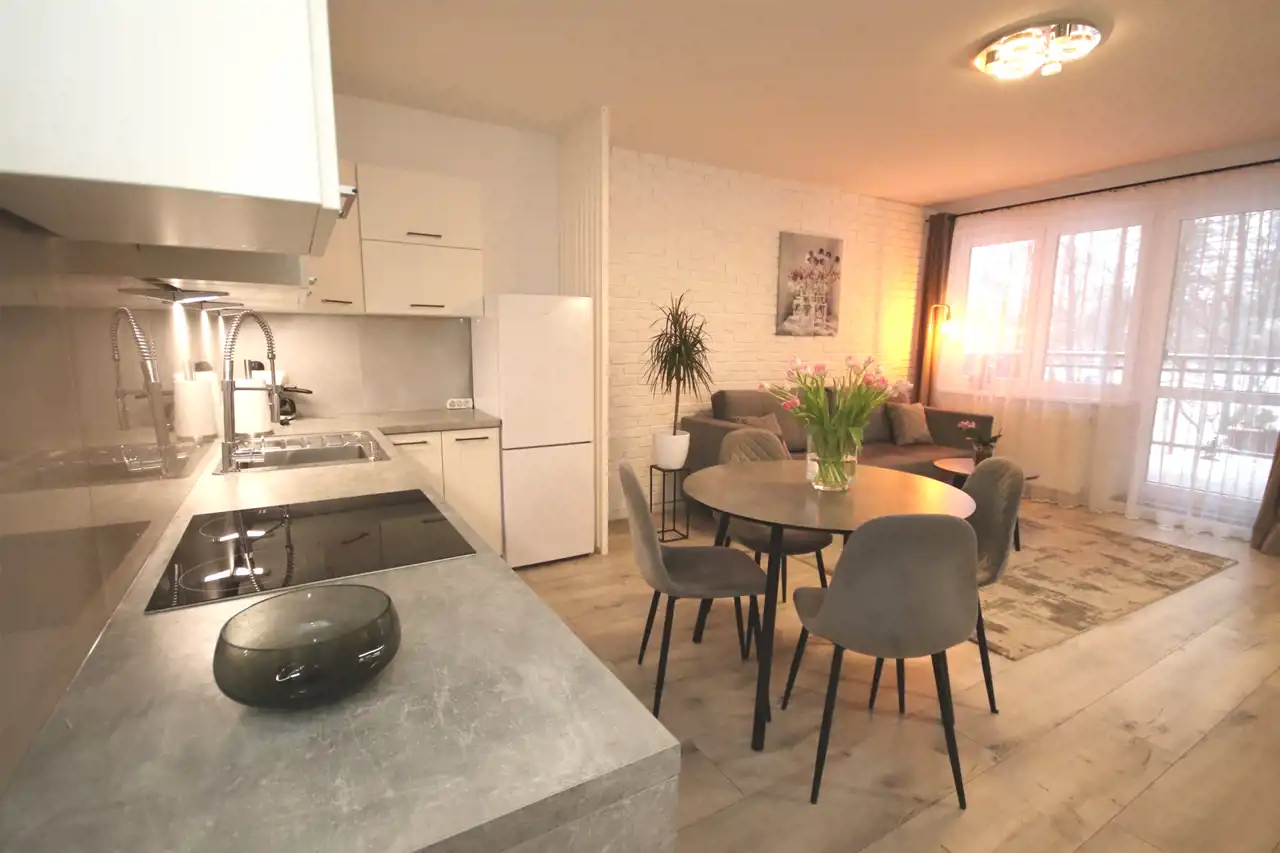 - W kuchni meble w zabudowie z wyposażeniem AGD (płyta indukcyjna, piekarnik, zmywarka, lodówka, okap);