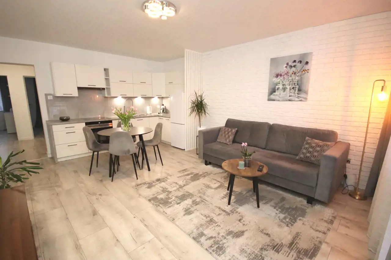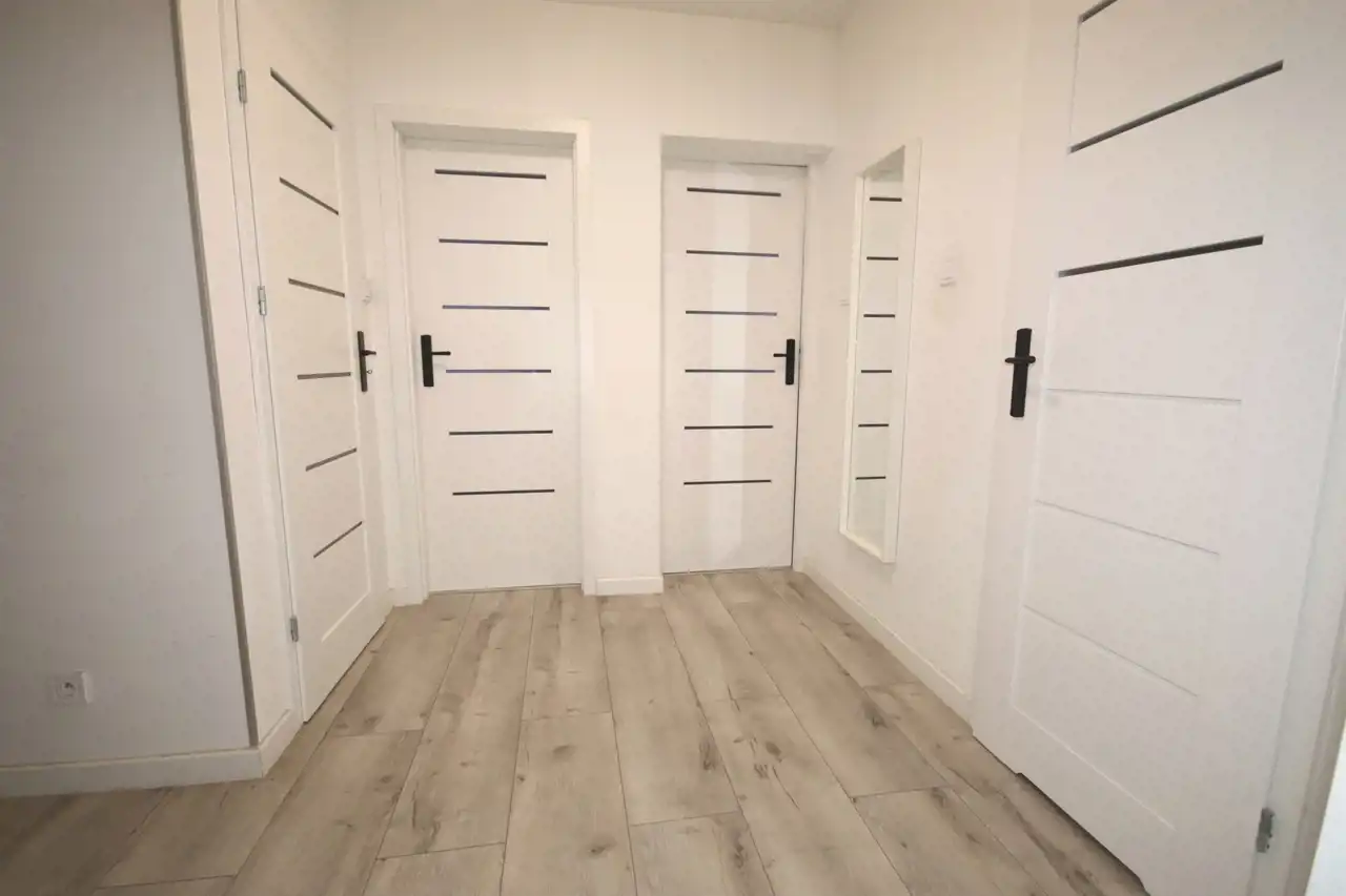 - Na podłogach panele (w pokojach i przedpokoju) i płytki (w łazience); w salonie ozdobna gipsowa cegła, ściany pomalowane na biało;