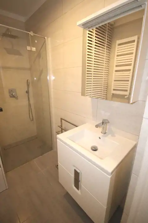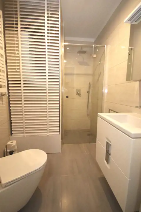 - W łazience pralka, prysznic, umywalka, lustro, toaleta;