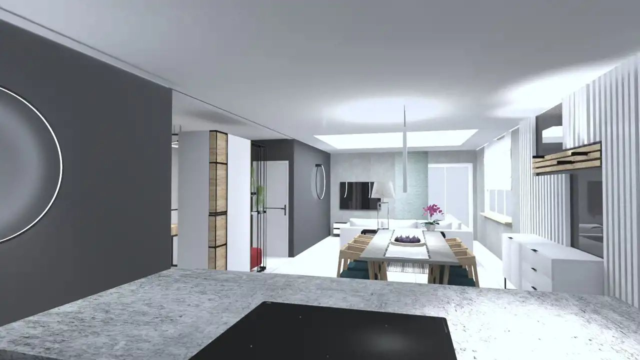 - duży salon z anekem kuchennym z wyspą oraz bezpośrednim wyjściem na duży taras o powierzchni około 30m2 (powierzchnia tarasu nie jest wliczona w podaną powierzchnie 150m2)