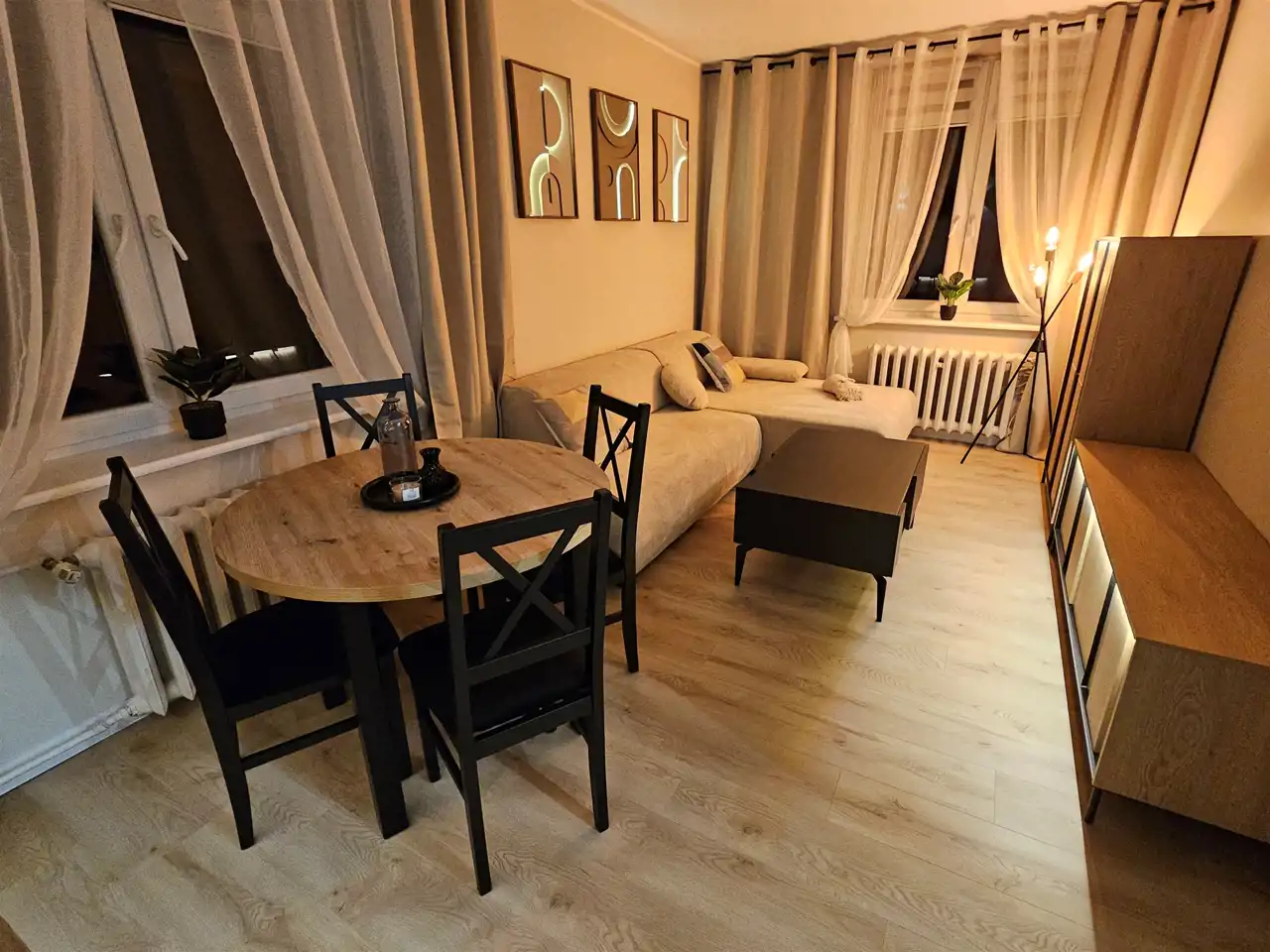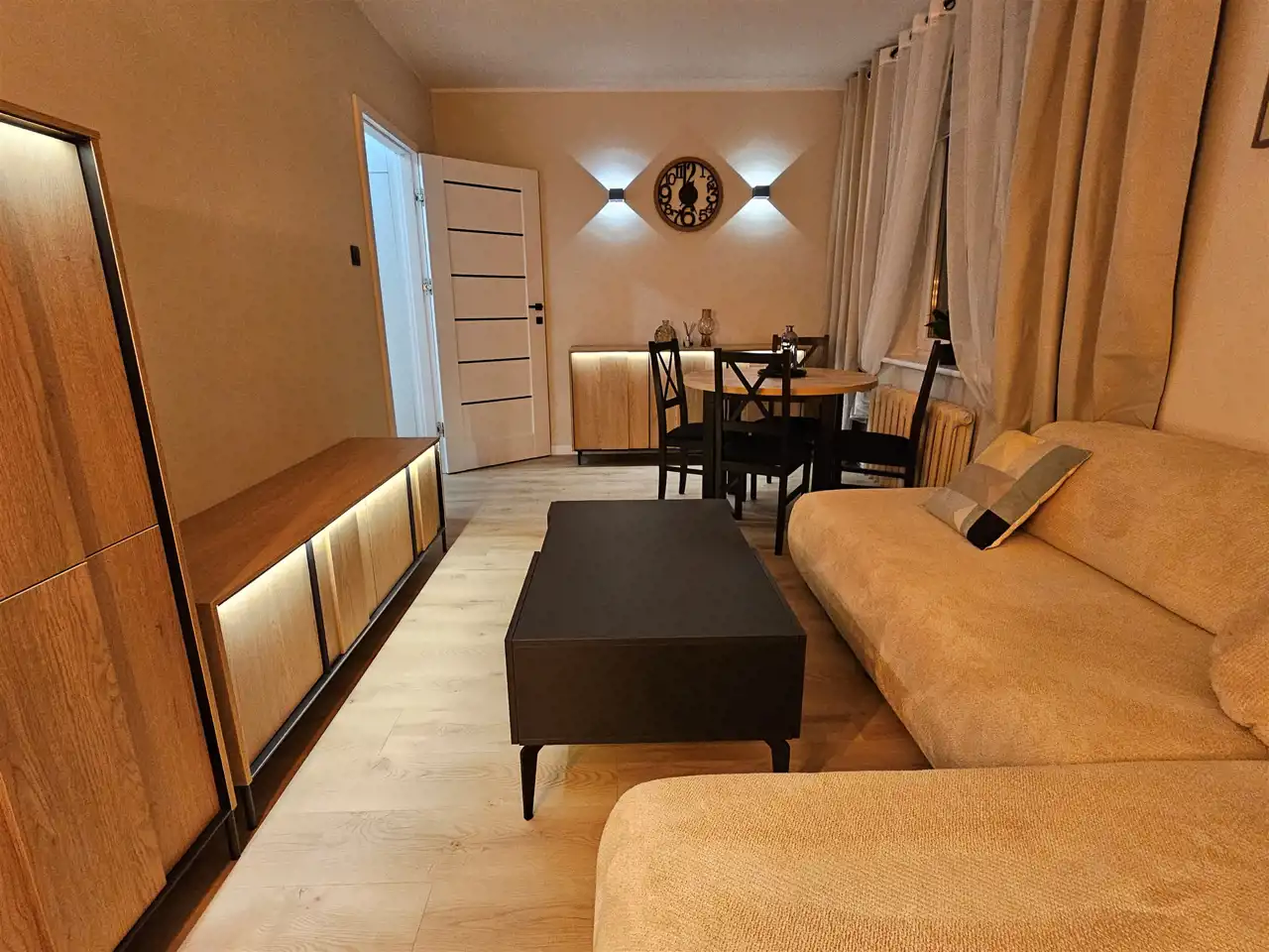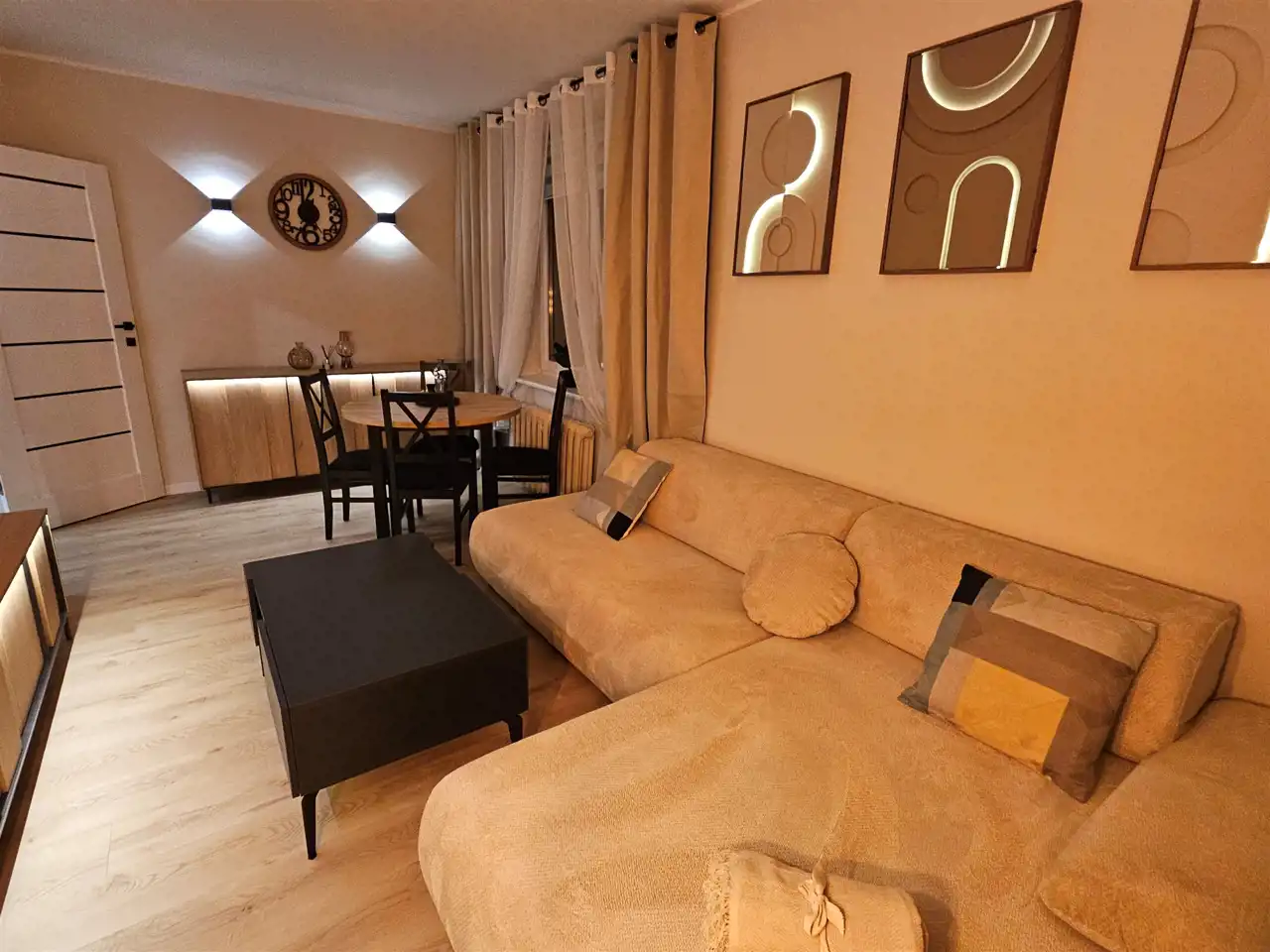 Wnętrze zostało nowocześnie wykończone i w pełni umeblowane- wszystko jest nowe przygotowane dla pierwszego najemcy, a elementy wyposażenia dobrano tak, aby tworzyły spójną, estetyczną przestrzeń do życia. Mieszkanie ma również bardzo przyjemny klimat wieczorem – dzięki nastrojowemu oświetleniu przy meblach i obrazach wnętrze staje się wyjątkowo przytulne i klimatyczne.