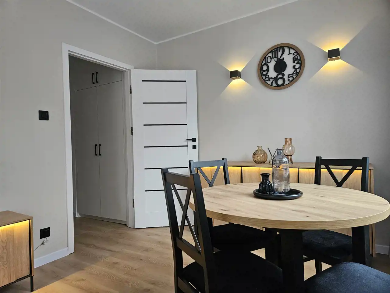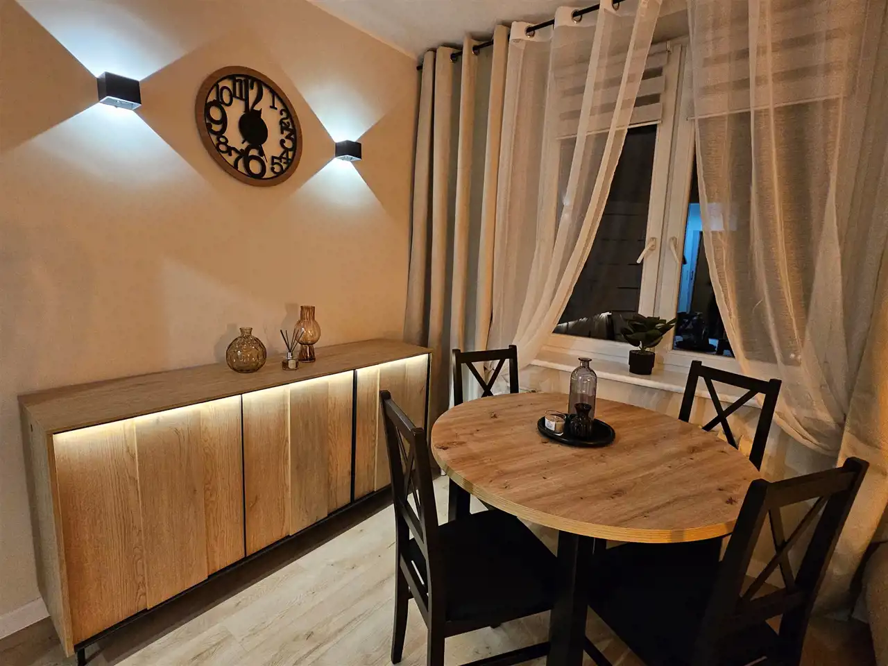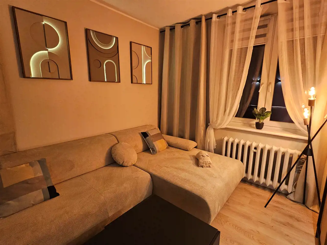 Wnętrze zostało nowocześnie wykończone i w pełni umeblowane- wszystko jest nowe przygotowane dla pierwszego najemcy, a elementy wyposażenia dobrano tak, aby tworzyły spójną, estetyczną przestrzeń do życia. Mieszkanie ma również bardzo przyjemny klimat wieczorem – dzięki nastrojowemu oświetleniu przy meblach i obrazach wnętrze staje się wyjątkowo przytulne i klimatyczne.