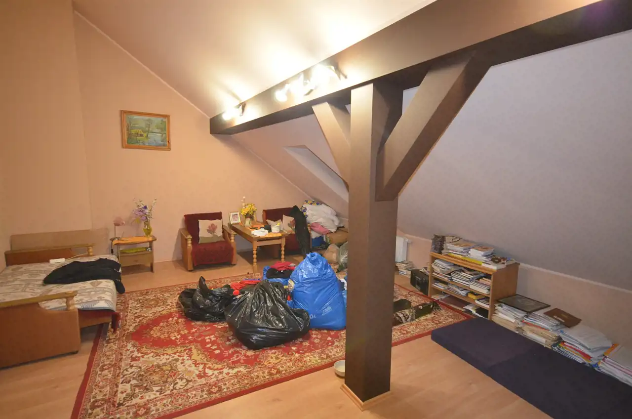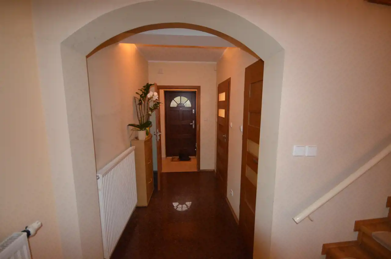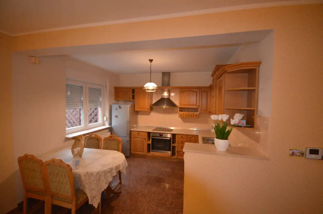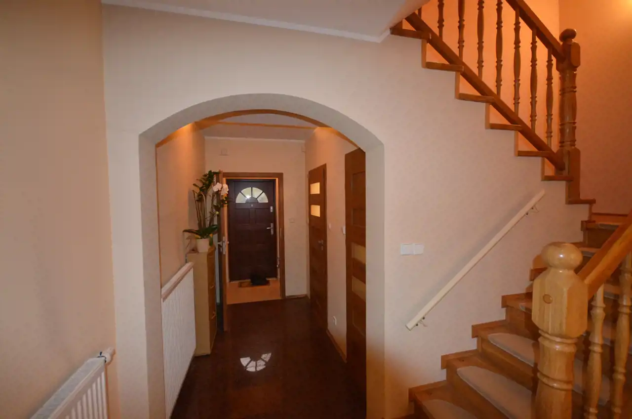 Na pierwszym piętrze znajdują się 3 pokoje, łazienka z wc i wanną. Na poddasze prowadzą również drewniane schody i jest tam zagospodarowany pokój, łazienka z wc oraz duży otwarty pokój z widokiem na ogród. Nieruchomość w pełni umeblowana w standardzie powyżej średniej, po remoncie 3 lata temu . Brama wjazdowa automatycznie zamykana na pilota.