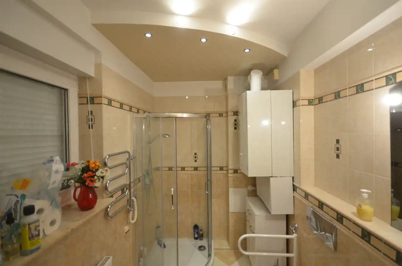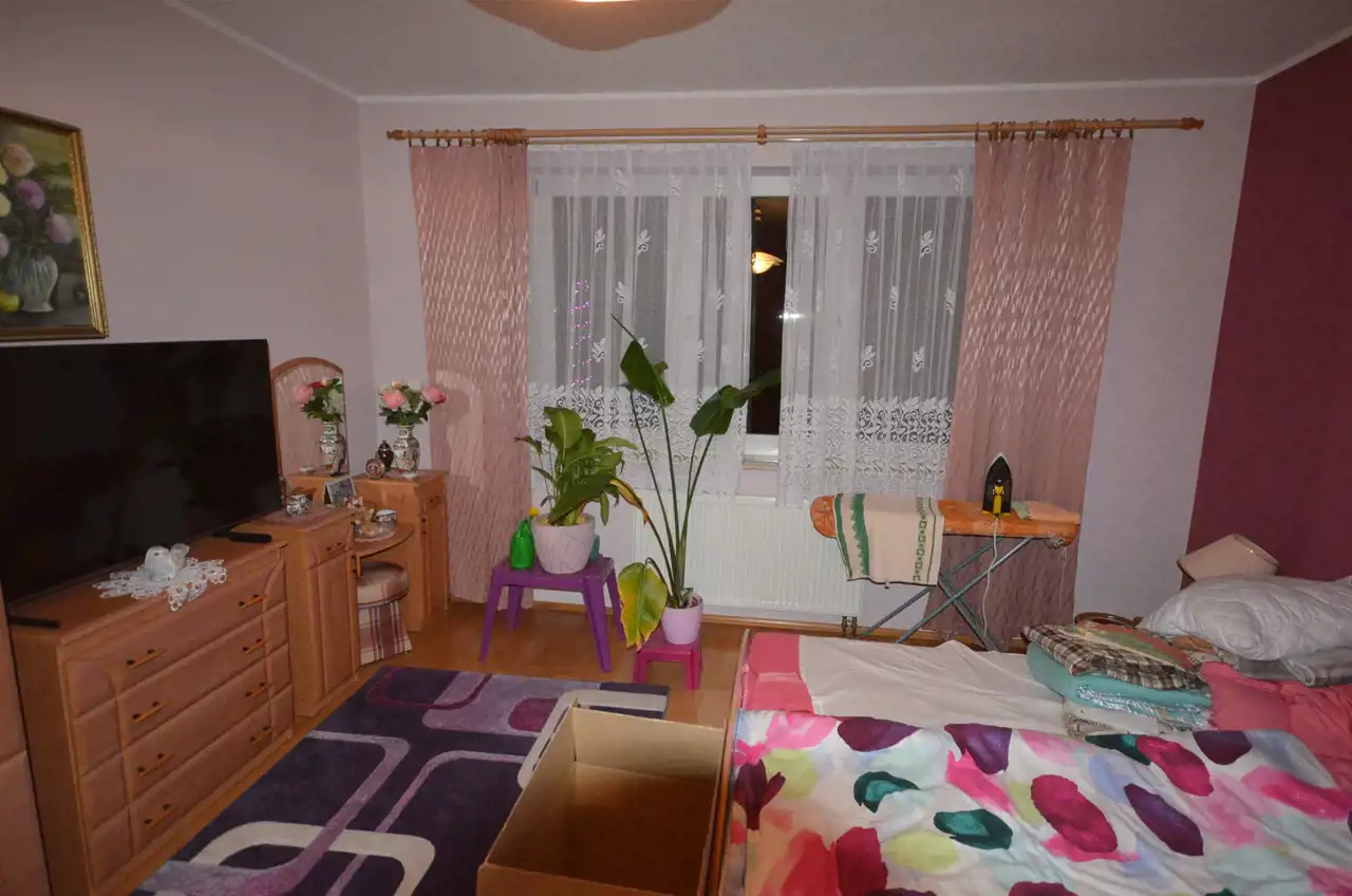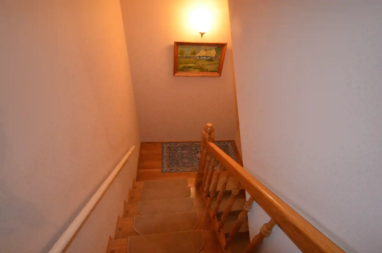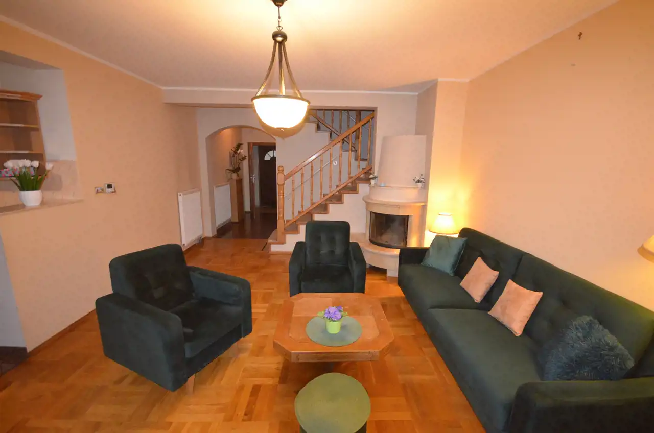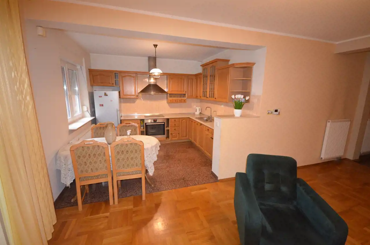 Na pierwszym piętrze znajdują się 3 pokoje, łazienka z wc i wanną. Na poddasze prowadzą również drewniane schody i jest tam zagospodarowany pokój, łazienka z wc oraz duży otwarty pokój z widokiem na ogród. Nieruchomość w pełni umeblowana w standardzie powyżej średniej, po remoncie 3 lata temu . Brama wjazdowa automatycznie zamykana na pilota.