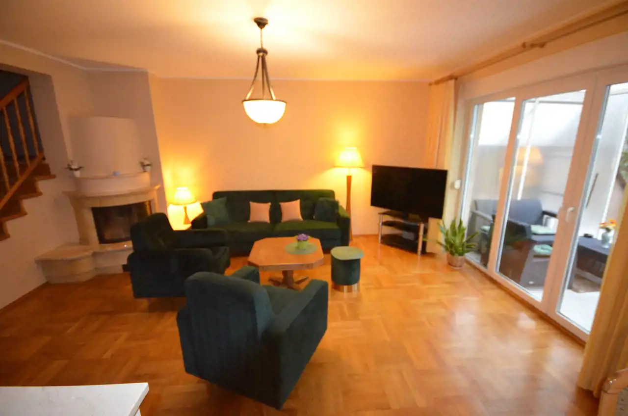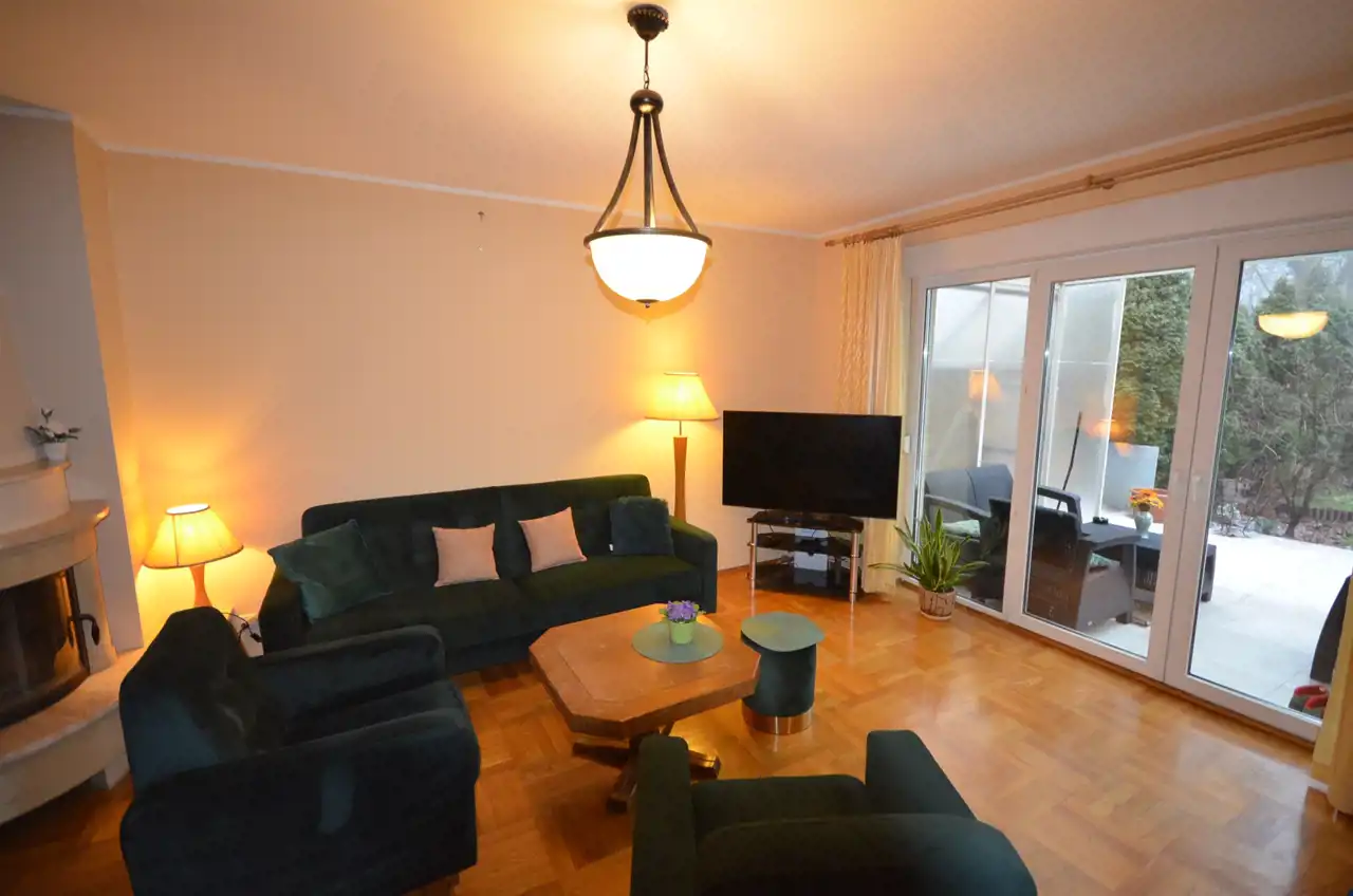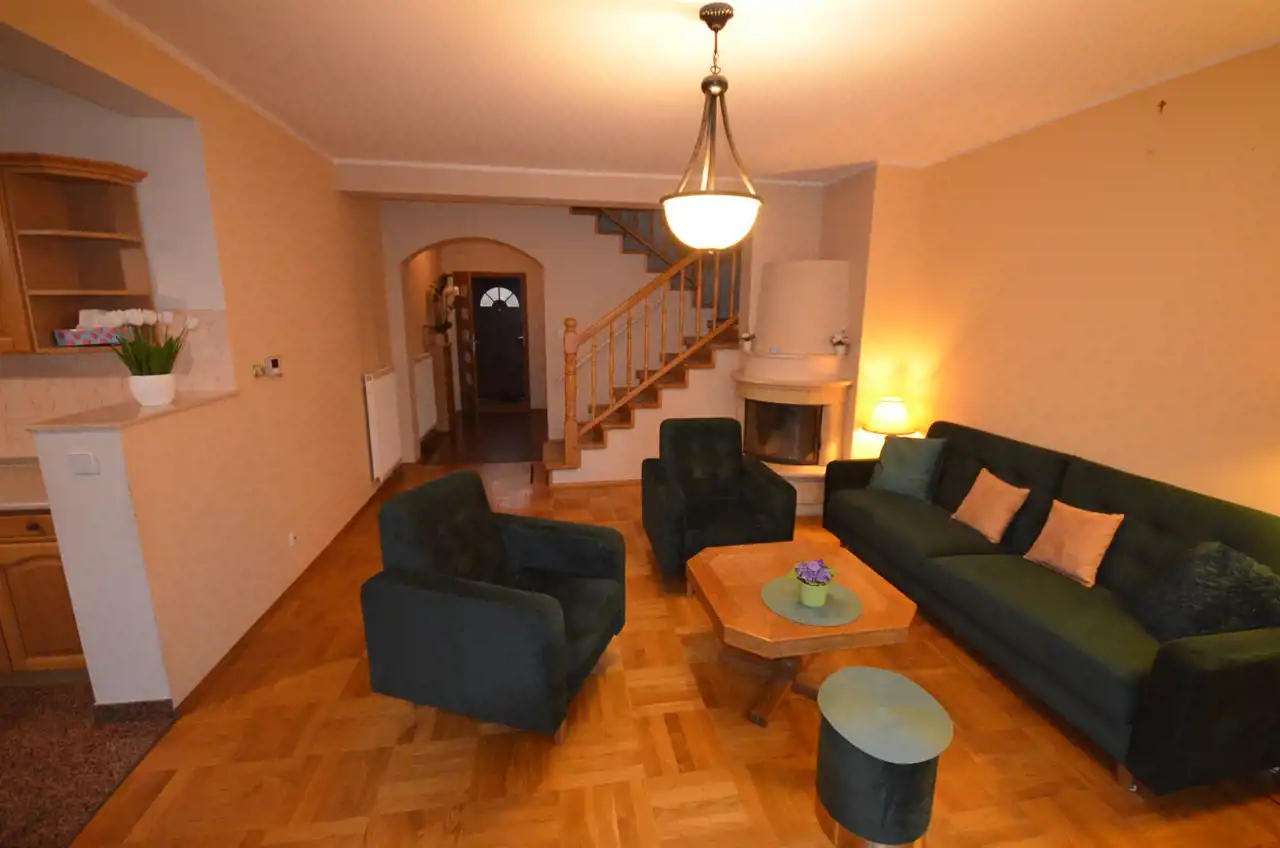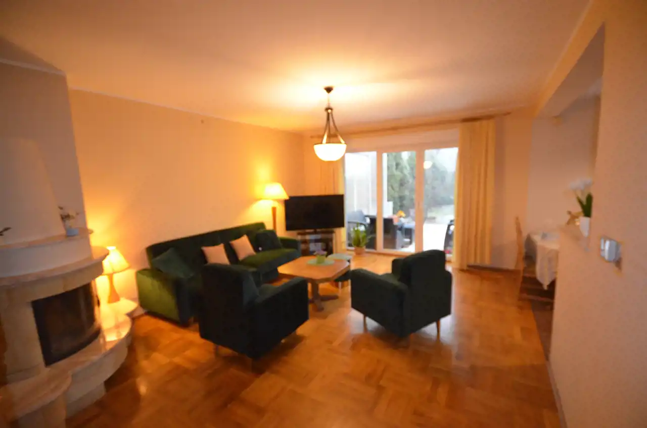Na parterze salon z kominkiem i wyjściem na taras i do zagospodarowanego ogrodka ,otwarta kuchnia - umeblowana -wyposażona w agd, oraz łazienka z wc, przejście do długiego garażu zamykanego automatycznie na pilota.
