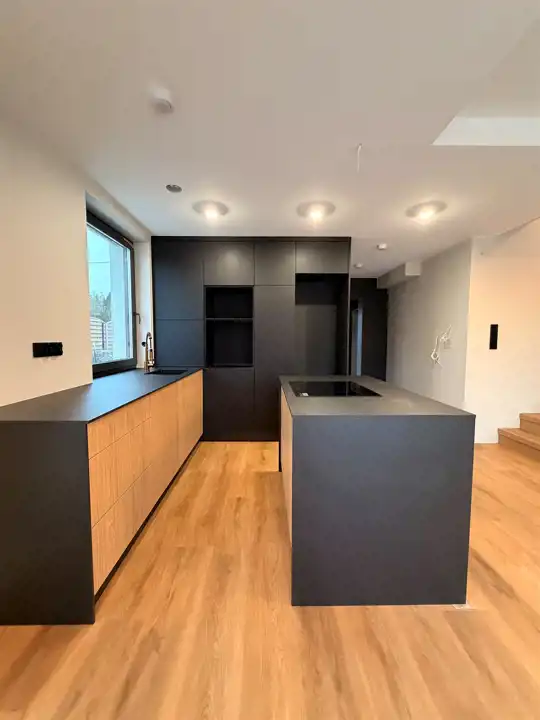 nowoczesna kuchnia w zabudowie na wymiar z blatem HPL i zlewem podwieszanym,