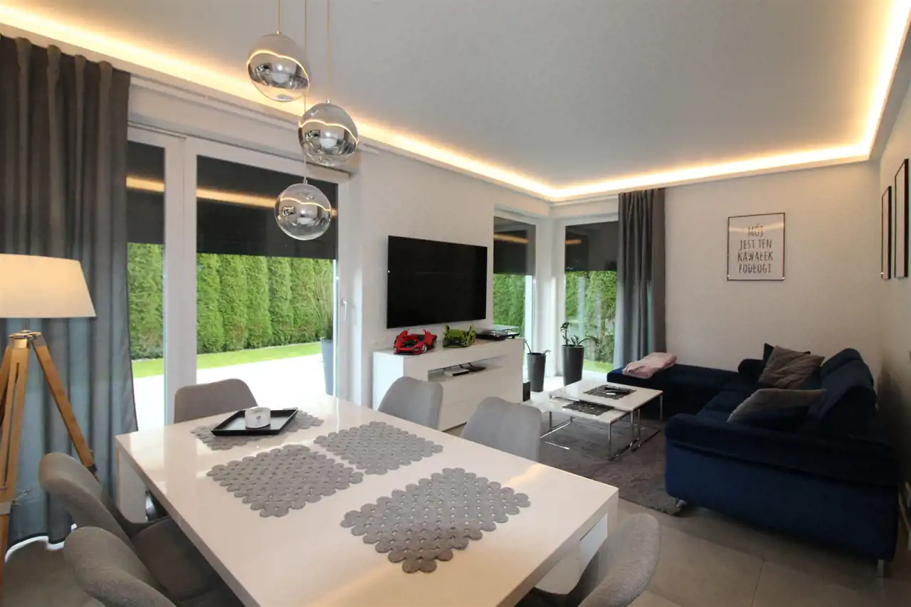 - salon z jadalnią (ok. 21 m2) z wyjściem na taras wykonanego z płyt z kamienia naturalnego i do zadbanego ogrodu,
