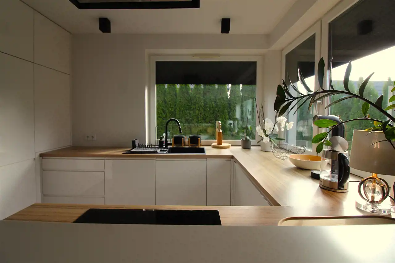 - kuchnia z meblami w zabudowie, z kompletnym sprzętem AGD marki BOSCH i półwyspem,