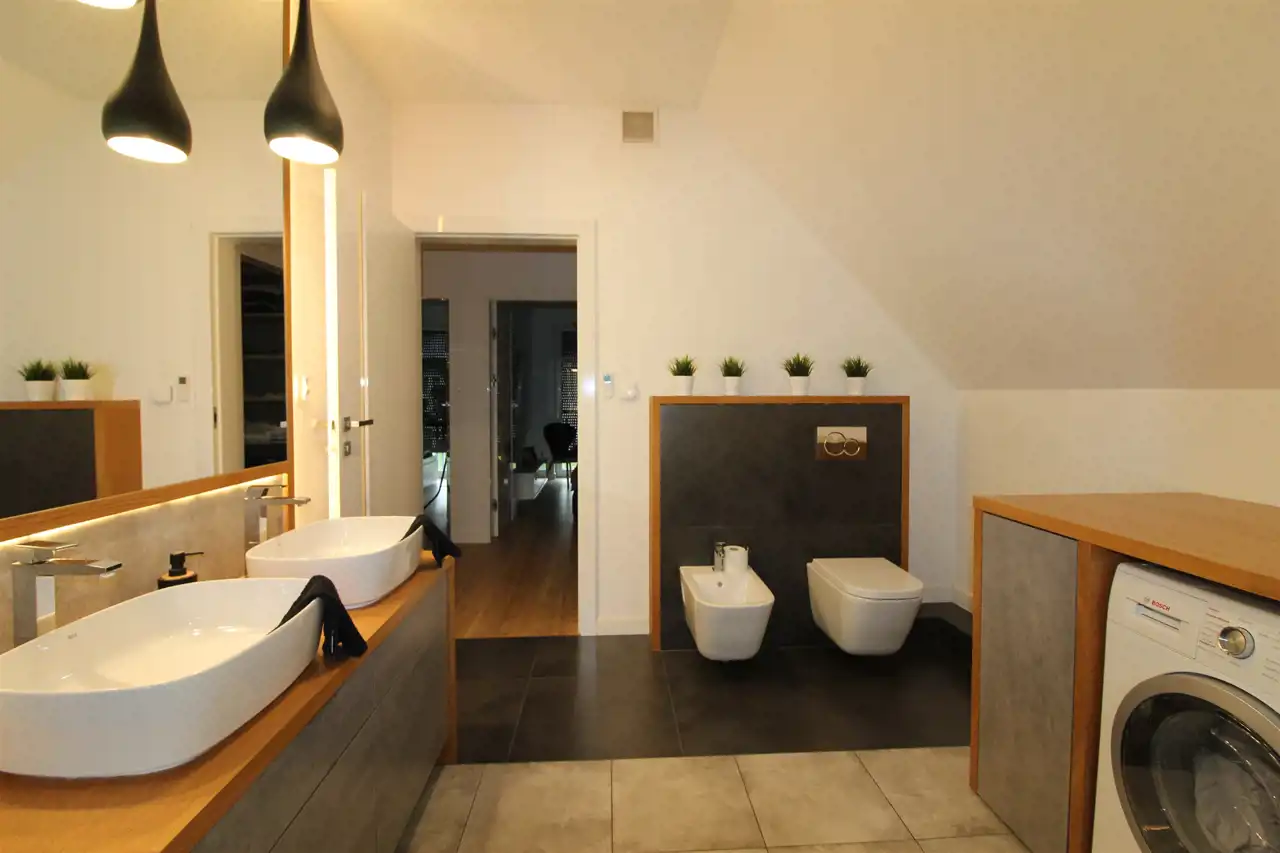 W domu znajduje się wiele komfortowych i praktycznych rozwiązań: system filtrowania i odkamieniania wody, system alarmowy, rolety zewnętrzne sterowane pilotem, system nawadniania ogrodu, robot koszący trawnik, nowy piec dwuobiegowy z zasobnikiem wody i wiele innych.