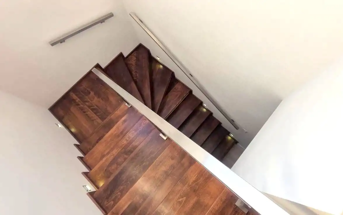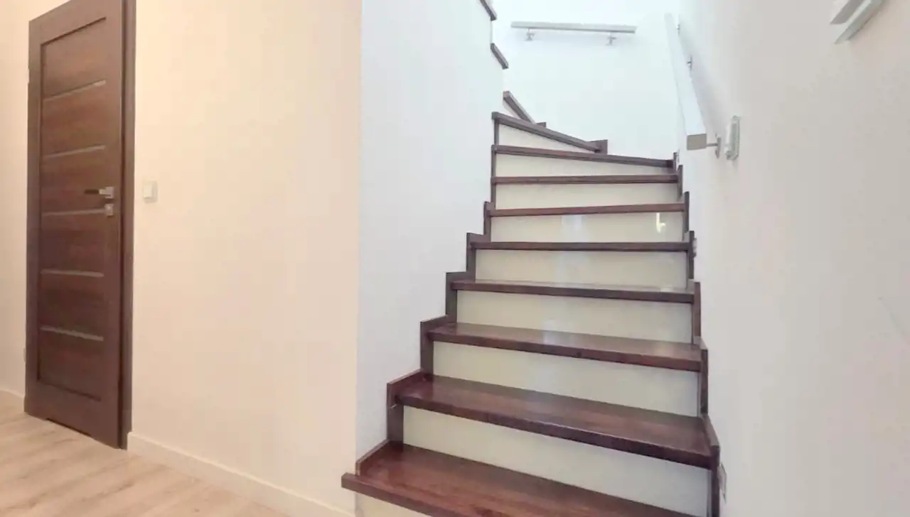 Na piętro prowadzą eleganckie, drewniane schody, które nadają wnętrzu ponadczasowy charakter.