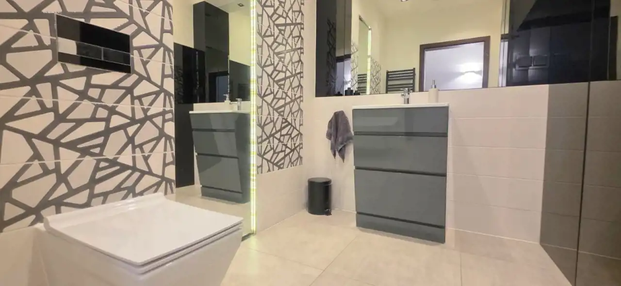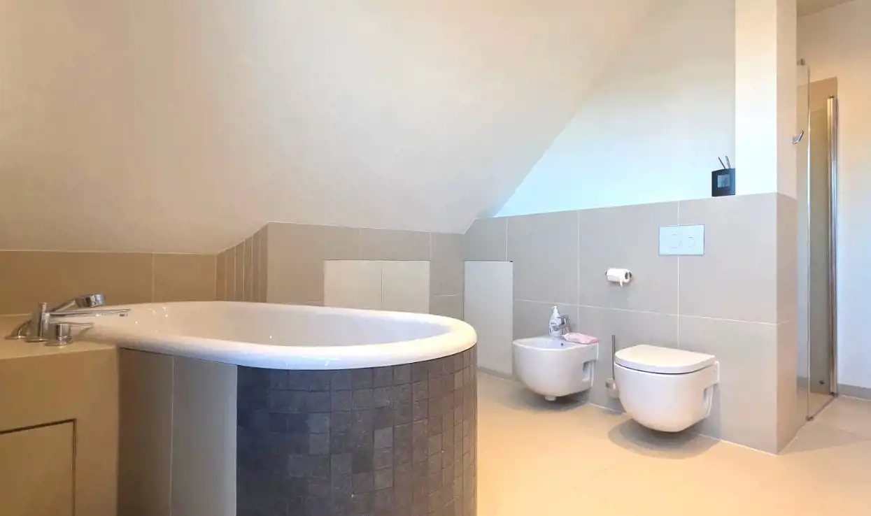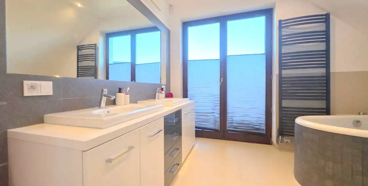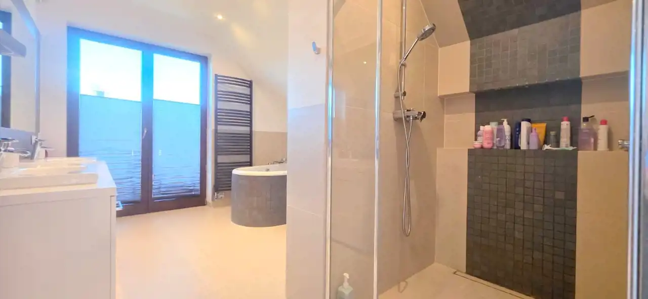 Imponująca, bardzo duża łazienka, pięknie doświetlona światłem dziennym, zaprojektowana jak domowa strefa relaksu. Wyposażona w wannę wolnostojącą, dużą kabinę prysznicową, dwa stanowiska umywalkowe, bidet oraz miskę ustępową.