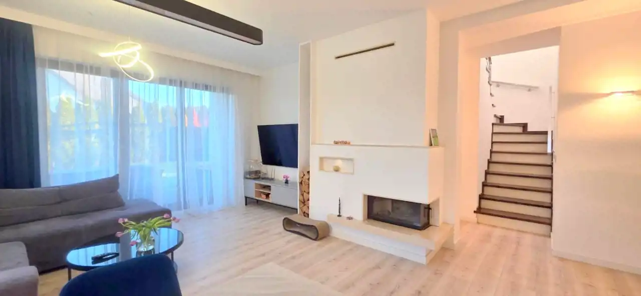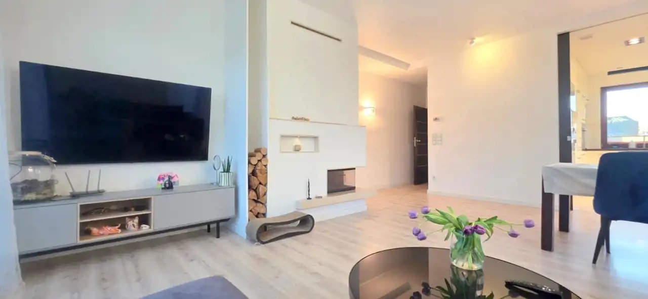 Przestronny, doskonale doświetlony salon z kominkiem tworzy ciepłą, przytulną atmosferę i stanowi naturalne centrum domu. To miejsce rodzinnych spotkań, wieczorów przy ogniu i chwil relaksu po długim dniu.