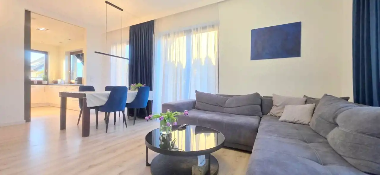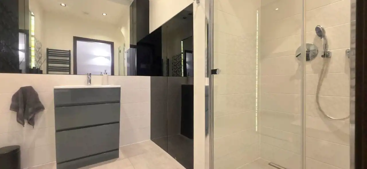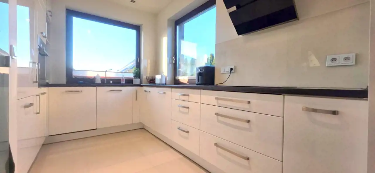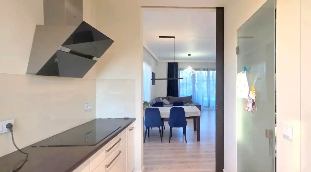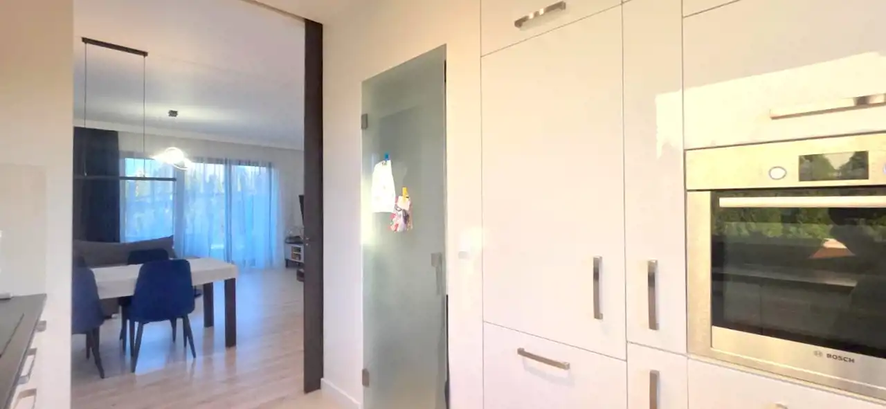 Kuchnia jest w pełni wyposażona, jasna i wyjątkowo funkcjonalna. Duży blat roboczy zapewnia komfort przygotowywania posiłków, a ergonomiczny układ doceni każdy, kto lubi gotować. Dodatkowym atutem jest możliwość zamknięcia kuchni dużym, przesuwnym skrzydłem drzwiowym w formie płyty meblowej, które harmonijnie wpisuje się w zabudowę i pozwala zachować spójny charakter wnętrza.