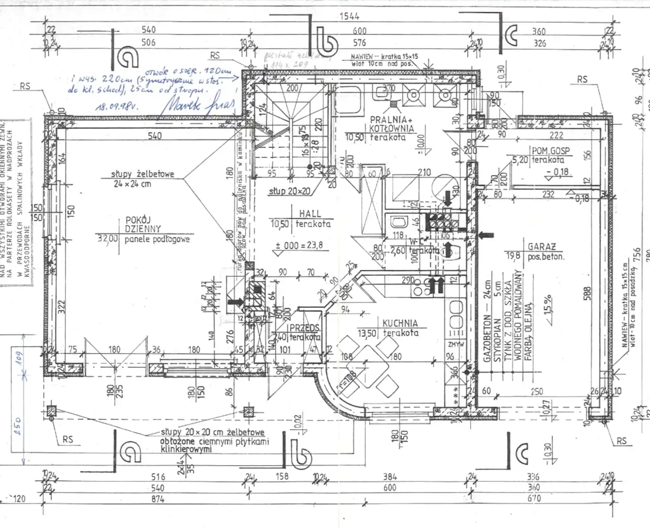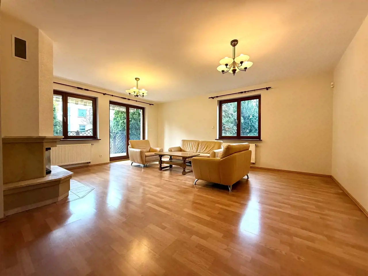 - salon (32 m²) z kominkiem i wyjściem na taras (16 m²) oraz do ogrodu,