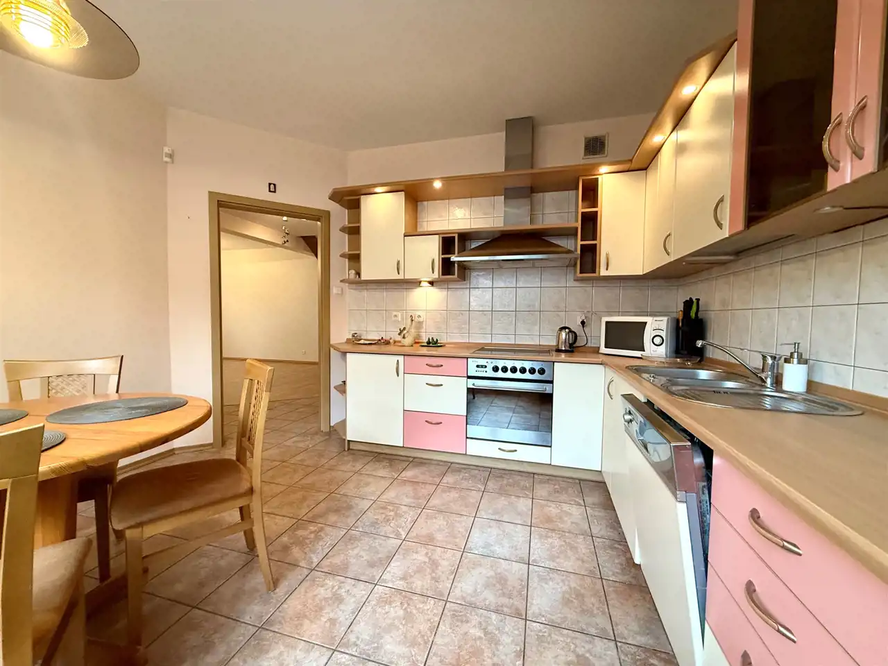 - kuchnia (13,5 m²) – w pełni umeblowana i wyposażona w sprzęt AGD (lodówka, zmywarka, piekarnik, płyta, okap),
