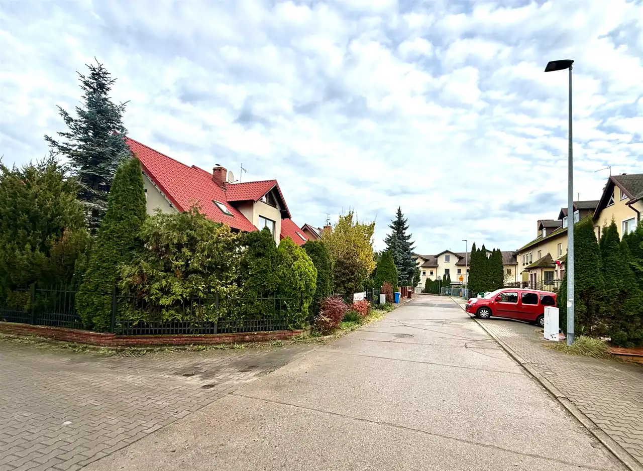 Cicha, spokojna ulica wśród zieleni, w otoczeniu domów jednorodzinnych.