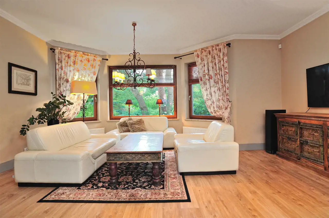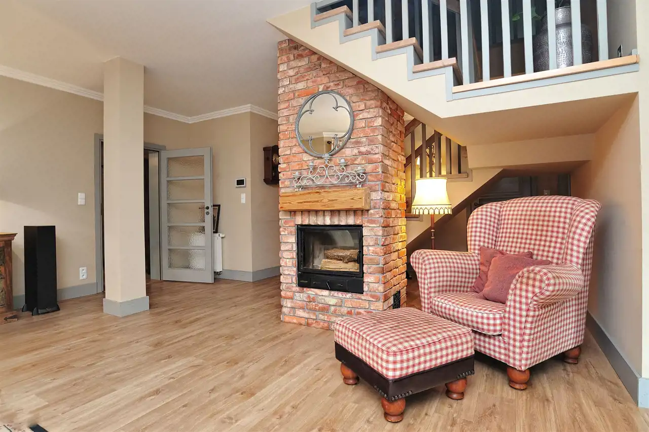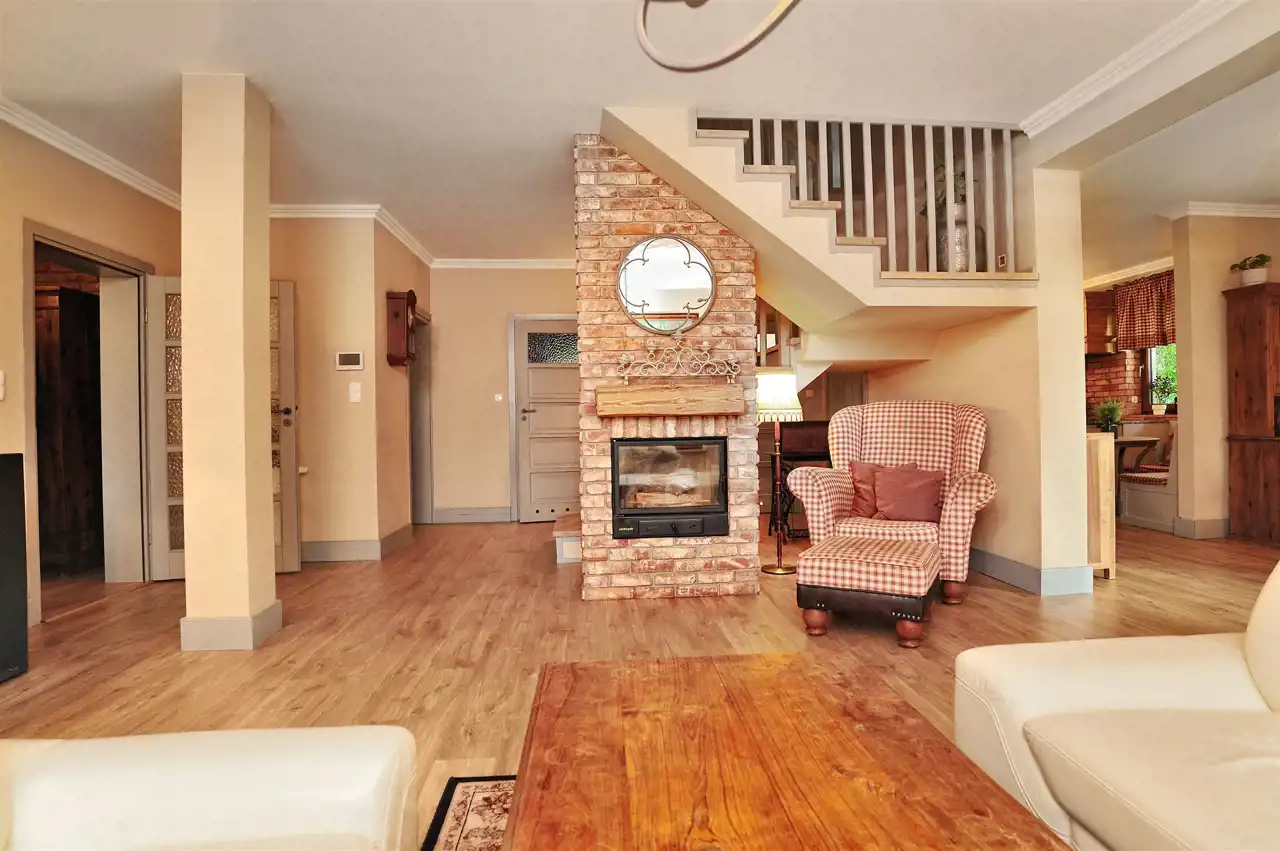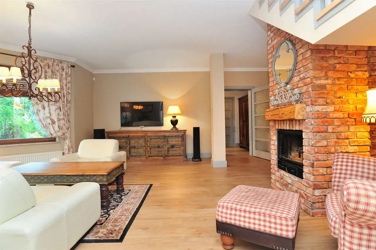 Wnętrza zostały zaprojektowane z myślą o wygodzie domowników. Przestronny, jasny salon z kominkiem stanowi centrum życia rodzinnego. Z salonu prowadzi wyjście na taras i do ogrodu, co sprzyja odpoczynkowi na świeżym powietrzu.