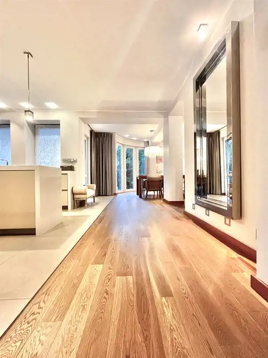 Podłogi wykonane zostały z litego dębu oraz włoskiego gresu najwyższej jakości, a prowadzące na kolejne kondygnacje schody z dębu kanadyjskiego z efektownym podświetleniem nadają wnętrzu nowoczesnej elegancji. Balustrady oraz ogrodzenie wykonano ze stali nierdzewnej i szkła, co dodatkowo podkreśla prestiżowy charakter nieruchomości.