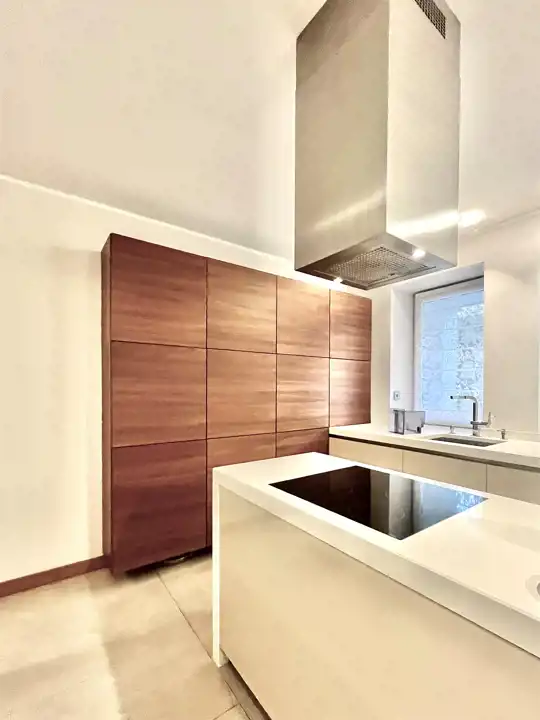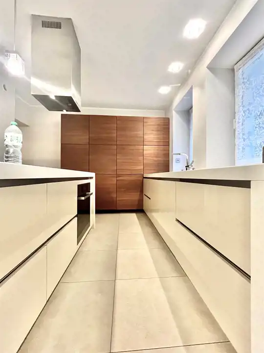 Kuchnia została zaprojektowana jako przestrzeń dla miłośników dobrego designu i funkcjonalności. Zabudowa łączy lakierowane oraz drewniane fronty z włoskimi marmurowymi blatami, a całość wyposażono w sprzęt premium marki Miele. Tuż obok znajduje się praktyczna spiżarnia.