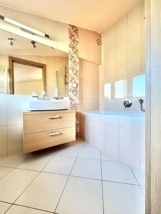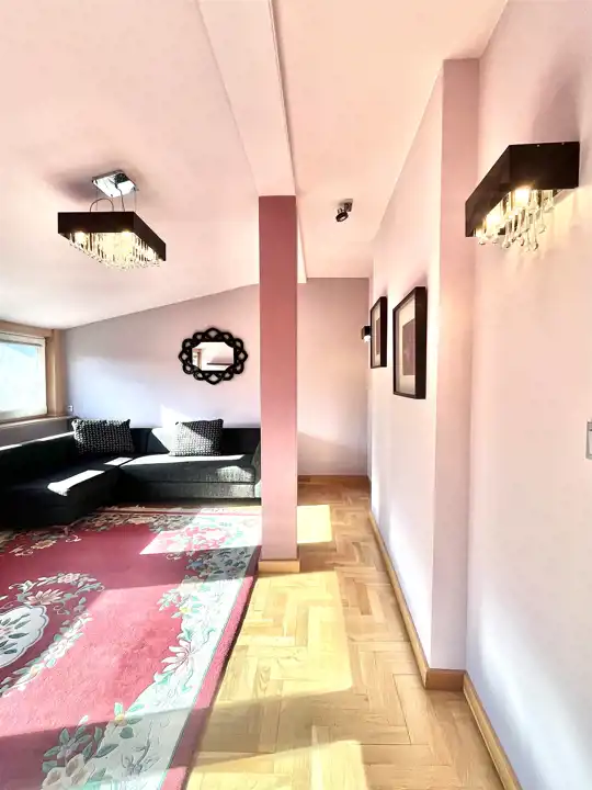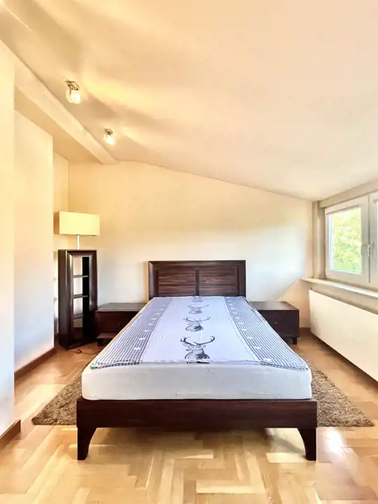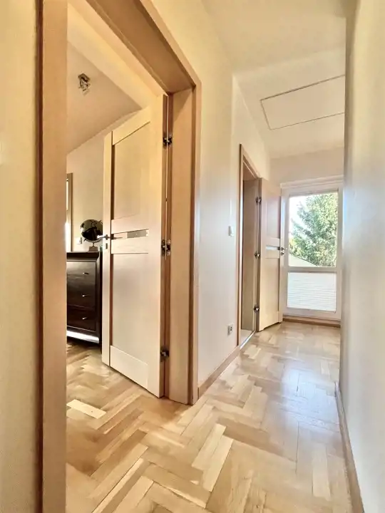 W domu znajduje się 6 przestronnych pokoi, w tym komfortowa sypialnia główna z elegancką łazienką wyposażoną w wannę, prysznic, bidet i wysokiej jakości armaturę. Na poddaszu zaprojektowano przytulną sypialnię gościnną z prywatną łazienką oraz dodatkowy pokój z dużą garderobą i wyjściem na taras.