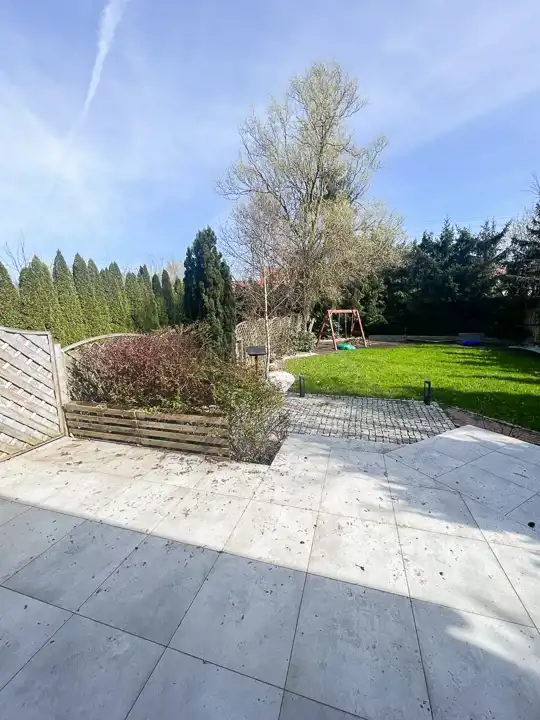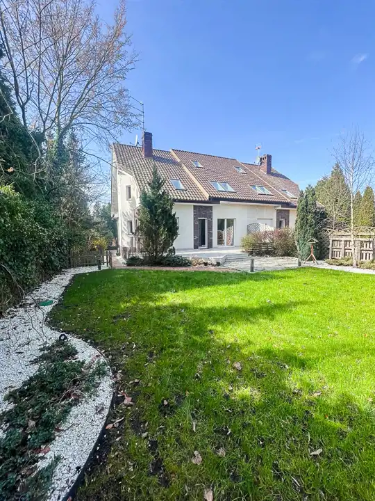 Otoczenie domu stanowi pięknie zagospodarowany ogród z licznymi nasadzeniami drzew, tworzący przyjemną przestrzeń do wypoczynku i relaksu. W pobliżu znajdują się lasy, stadnina koni oraz sklepy, co czyni tę lokalizację idealną dla osób ceniących ciszę, spokój i bliskość natury, bez rezygnacji z wygody codziennego życia.