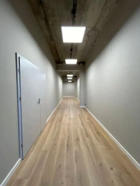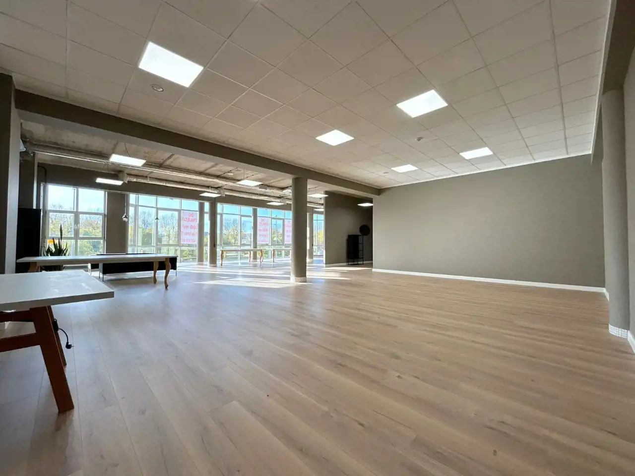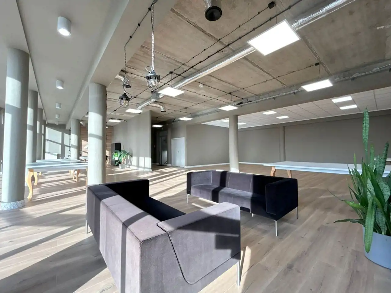 Nowoczesny, industrialny charakter wnętrza podkreślają loftowe sufity oraz drewniane panele podłogowe, które dodają przestrzeni ciepła i elegancji.