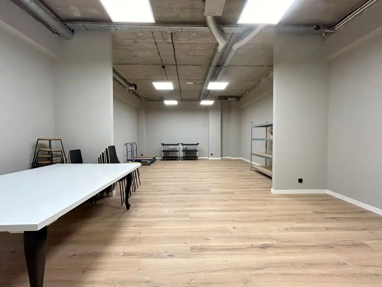 Lokal zaprojektowano z myślą o funkcjonalności i estetyce. Wnętrze stanowi duża, otwarta przestrzeń z wysokimi sufitami (3,7 m), która daje szerokie możliwości aranżacyjne – od showroomu, po powierzchnię biurową typu open space.