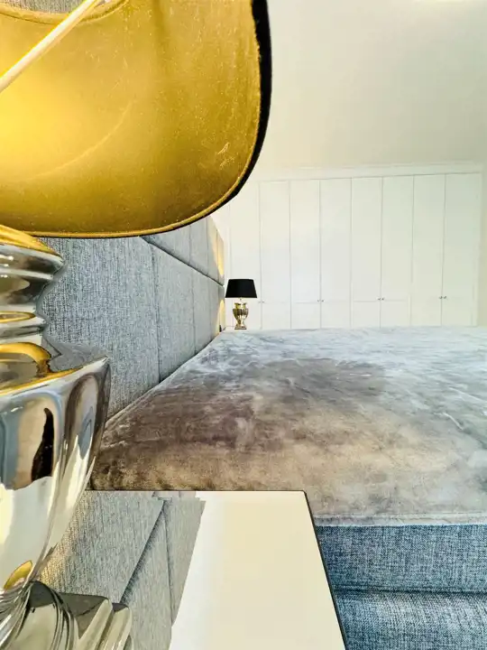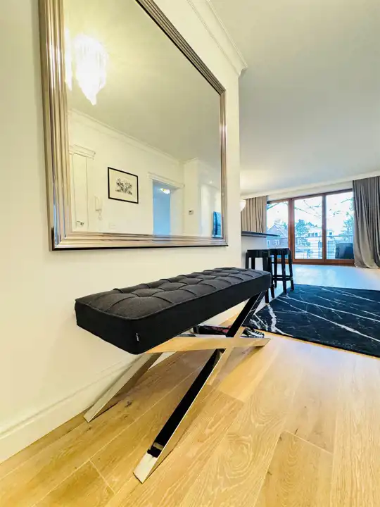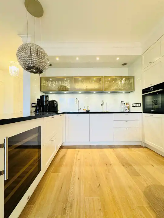 Wnętrze zostało zaprojektowane przez architekta wnętrz i wykończone z najwyższą starannością, przy użyciu materiałów klasy premium. Drewniane podłogi, zabudowy stolarskie na wymiar z podświetleniem oraz starannie dobrane detale tworzą spójną, elegancką przestrzeń. Wyposażenie renomowanych marek, takich jak Kettler oraz Eichholtz, podkreśla prestiż i ponadczasowy charakter apartamentu.