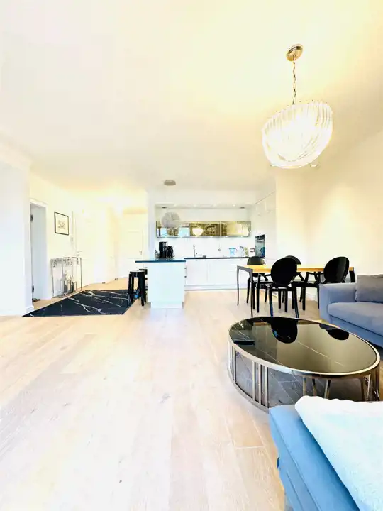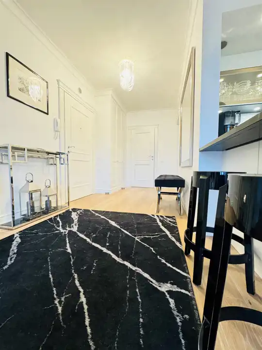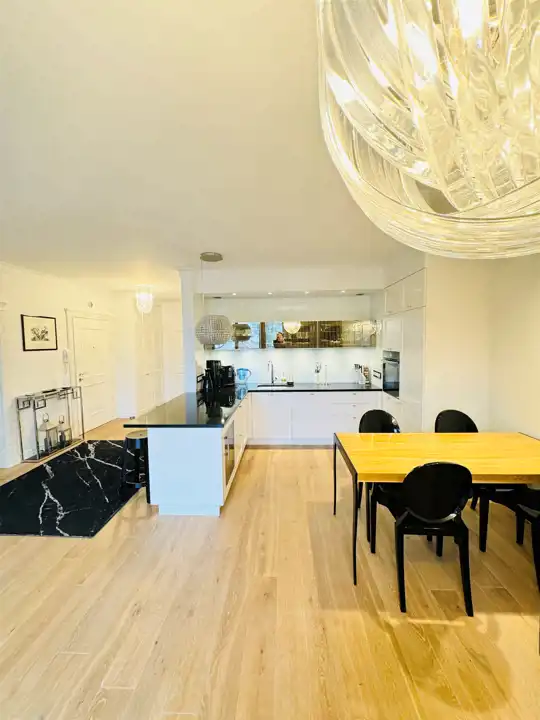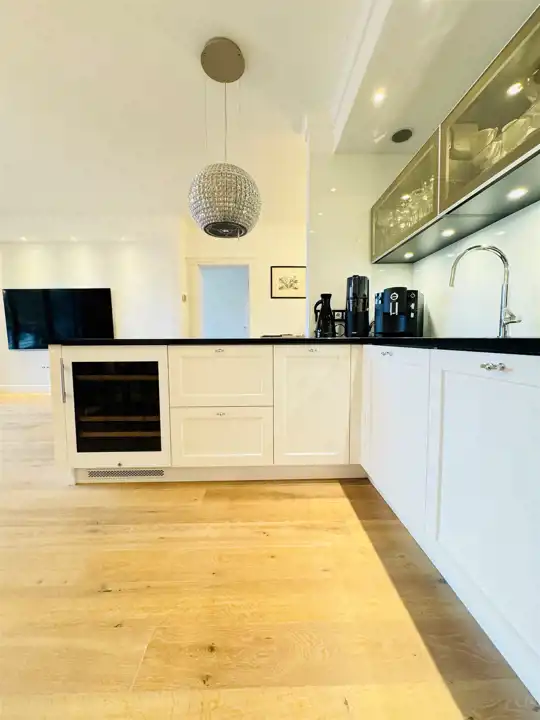The interior has been designed and finished with exceptional attention to detail, using premium-quality materials. Elegant wooden flooring, custom-built cabinetry with integrated lighting, and carefully selected design elements create a cohesive and sophisticated space. Furnishings from renowned brands such as Kettler, along with lighting and accessories by Eichholtz, enhance the apartment’s exclusive character.