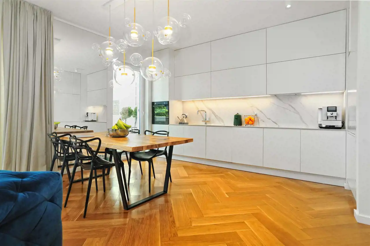 Nowoczesna, otwarta kuchnia w pełni wyposażona w sprzęt AGD