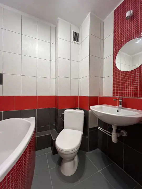 -łazienka z wc, wyposażona w narożną wannę oraz umywalkę