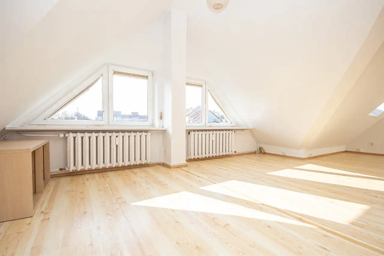 świeżo wymienione okna połaciowe, budynek po remoncie dachu z zadbaną klatką schodową.
