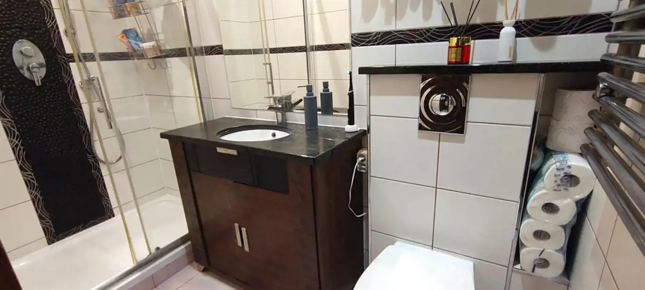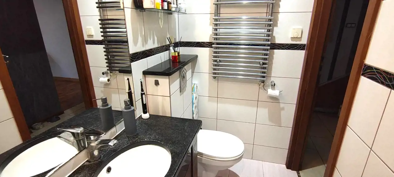 Łazienka wyposażona w natryskową kabinę, umywalkę, wc, grzejnik drabinkowy, Na podłodze płytki.