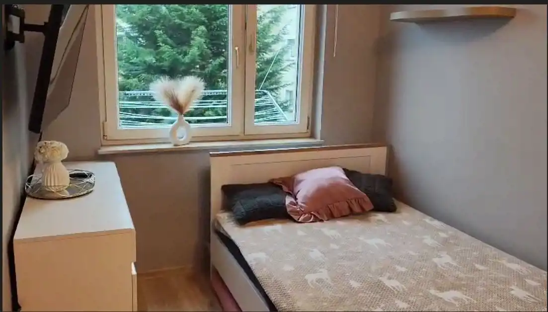 Sypialnia o powierzchni ok. 10 m2 z zabudową. Podłoga z paneli dobrej jakości.