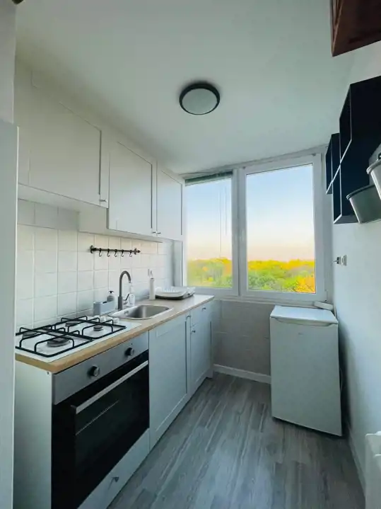 Mieszkanie składa się z dwóch niezależnych, ustawnych pokoi, osobnej kuchni, łazienki z WC oraz przedpokoju. Z okien rozpościera się przyjemny widok na park, co zapewnia poczucie przestrzeni i zieleni mimo centralnej lokalizacji.
