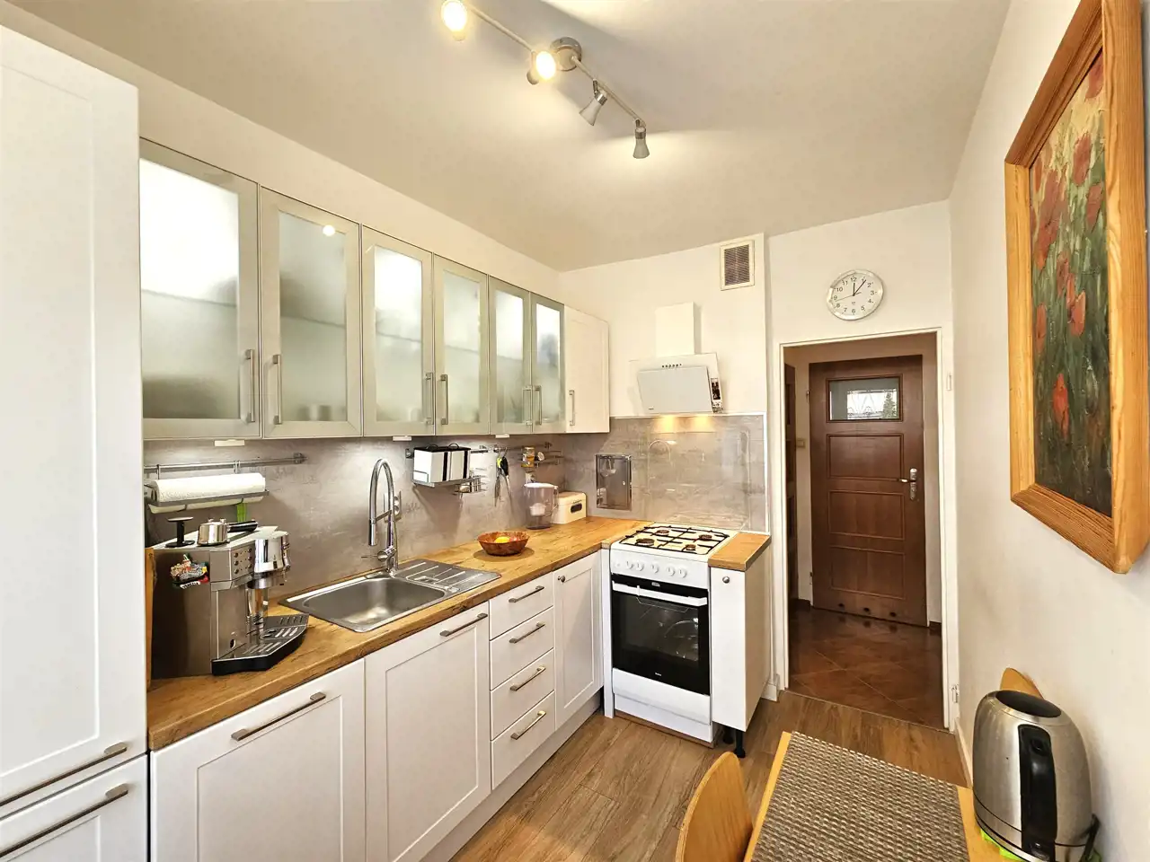 W cenie mieszkania pozostaje większość umeblowania oraz zabudowa kuchenna z lodówką, kuchenką, pochłaniaczem i zmywarką.