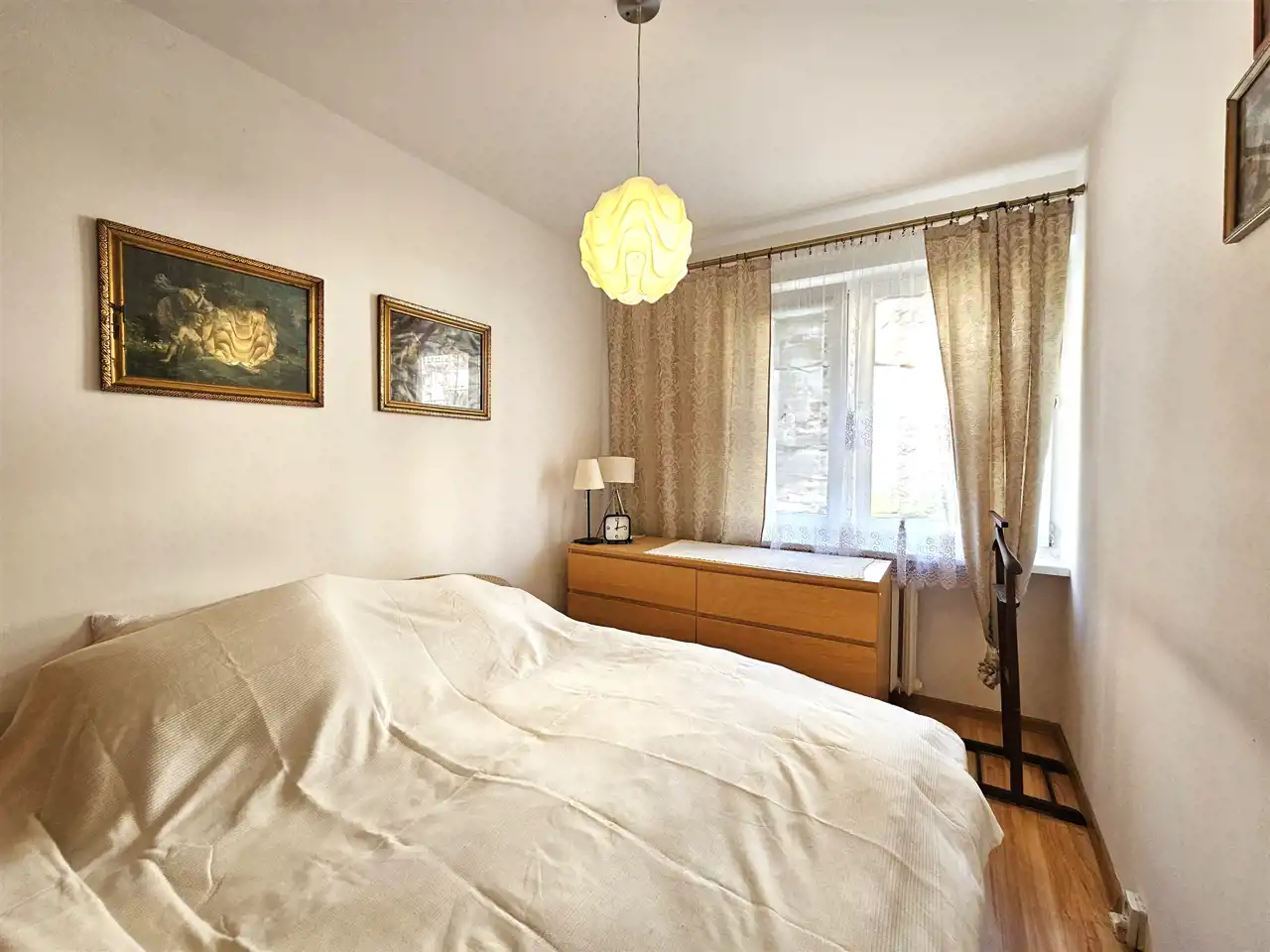 Mieszkanie o powierzchni 49,4 m2. Składa się z przestronnego salonu, sypialni, oddzielnej kuchni z oknem, łazienki z kabiną prysznicową, oddzielnego WC oraz korytarza. Z salonu wyjście na duży balkon, a z niego bezpośrednie zejście do ładnie zagospodarowanego ogródka. Ogrzewanie i ciepła woda z sieci miejskiej. Mieszkanie ciepłe środkowe. Co roku występują duże zwroty z tytułu ogrzewania.