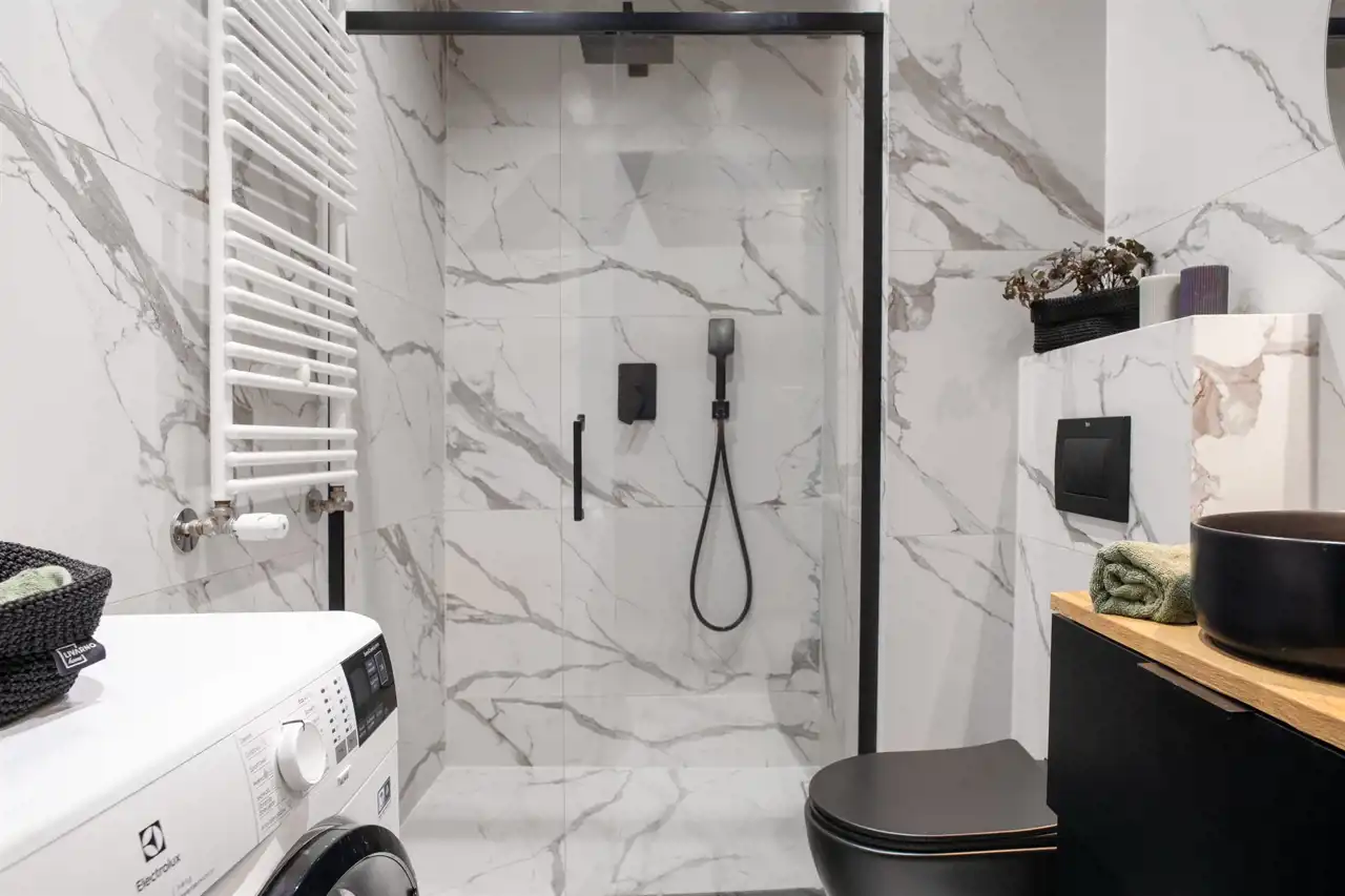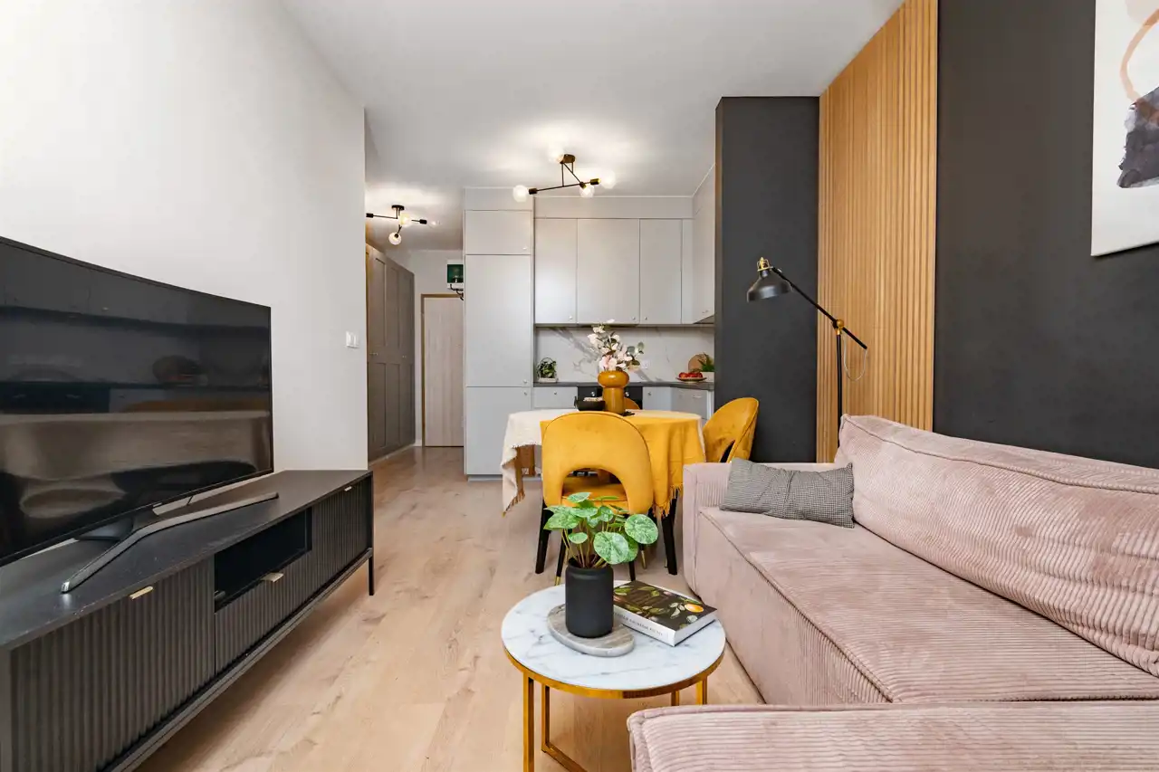 Wnętrze jest w pełni umeblowane i wyposażone w niezbędne sprzęty AGD, takie jak zmywarka, lodówka, piekarnik, płyta grzewcza, pochłaniacz oraz pralka. Dzięki temu nowy właściciel może wprowadzić się od razu, zabierając jedynie osobiste rzeczy. Mieszkanie może również stanowić atrakcyjną opcję inwestycyjną, gotową do wynajmu bez dodatkowych nakładów.