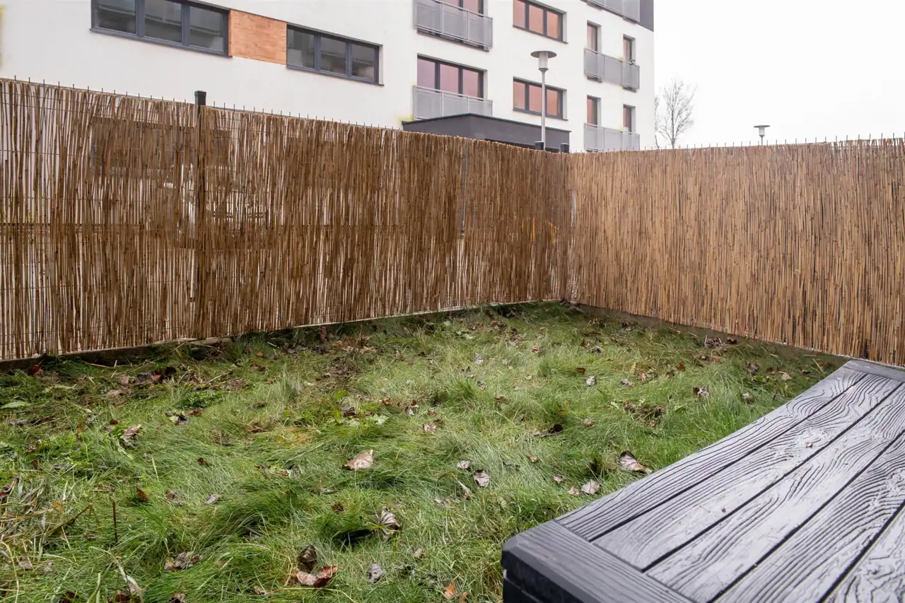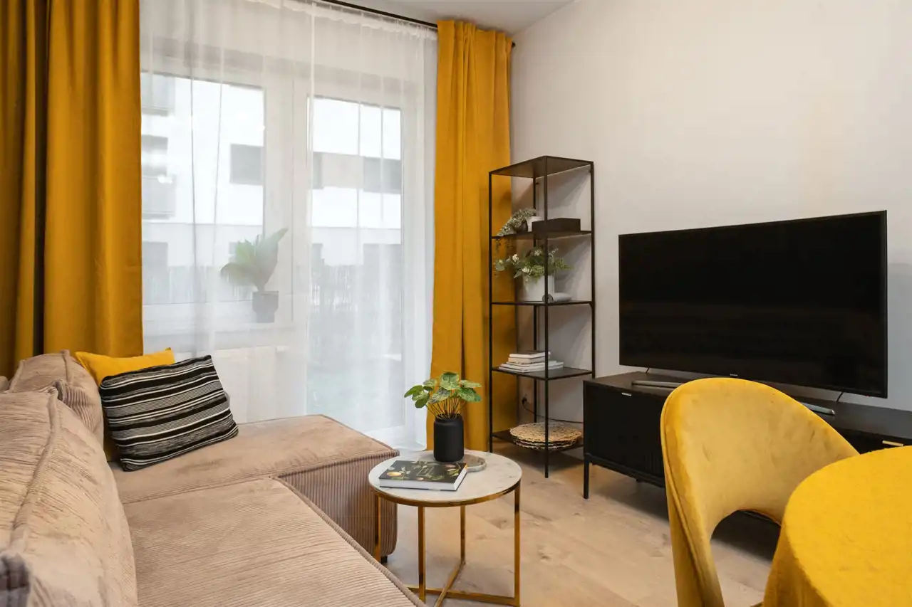 Mieszkanie składa się z pokoju dziennego z aneksem kuchennym, sypialni, przedpokoju oraz łazienki. Z obu pokoi można wyjść na przydomowy ogródek o powierzchni 20 m², który daje możliwość relaksu na świeżym powietrzu.