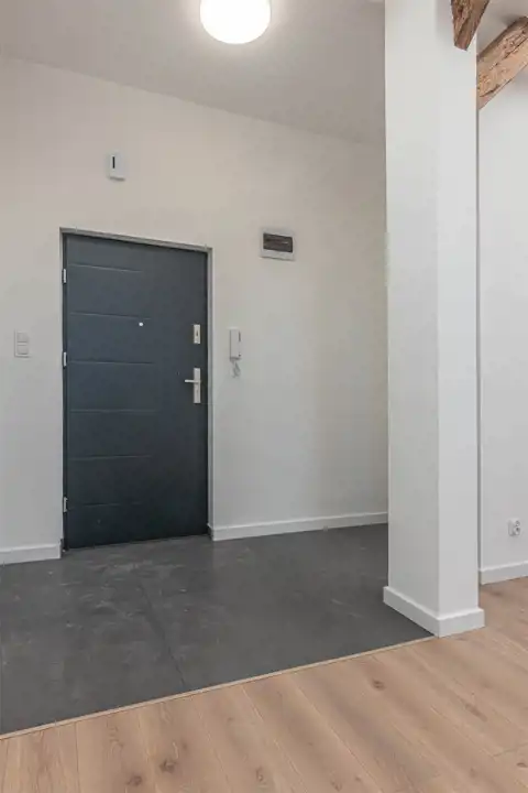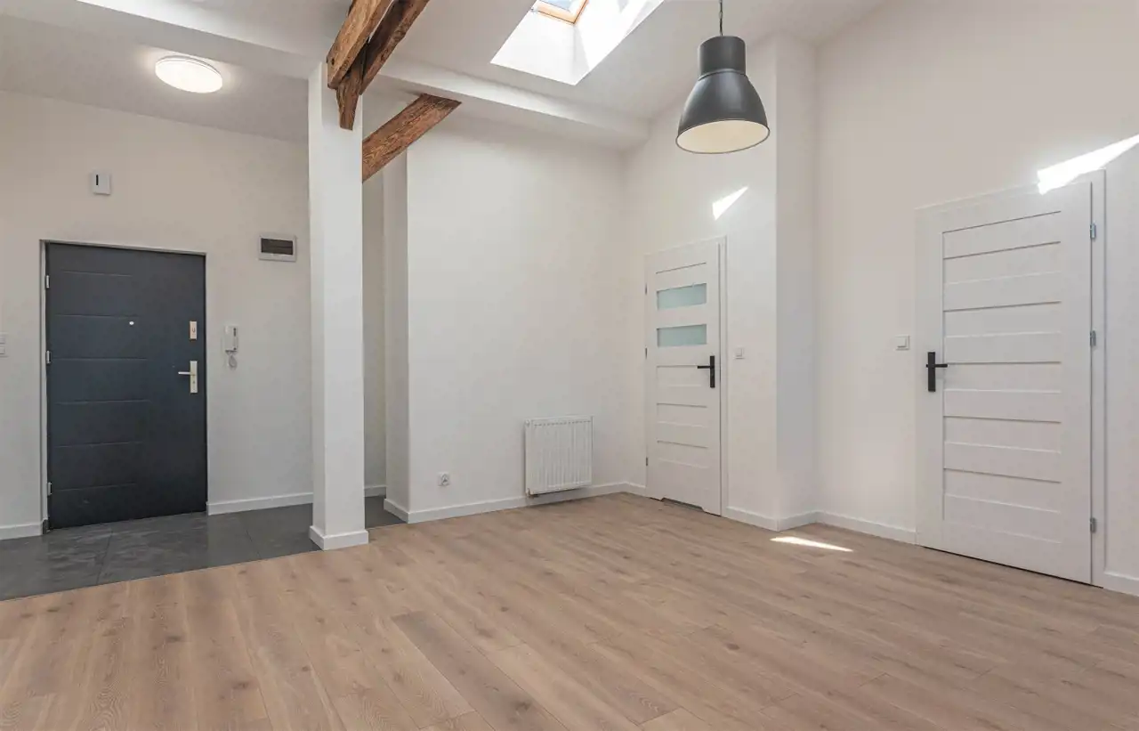 Lokal wykończony pod klucz, w pokojach na podłodze nowe panele, ściany gładzone, malowane, stolarka drzwiowa nowa. Okna połaciowe, drewniane Velux. Kuchnia w formie aneksu umeblowana i wyposażona w sprzęt AGD: płyta elektryczna, piekarnik elektryczny, okap oraz nowa, zabudowana lodówka z zamrażalką. Podłoga w części aneksu wyłożona terakotą. Łazienka razem z wc, duża kabina prysznicowa, na podłodze terakota, ściany wyłożone glazurą, w łazience miejsce na pralkę. W przedpokoju na podłodze terakota, drzwi nowe, antywłamaniowe.