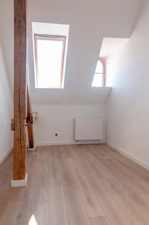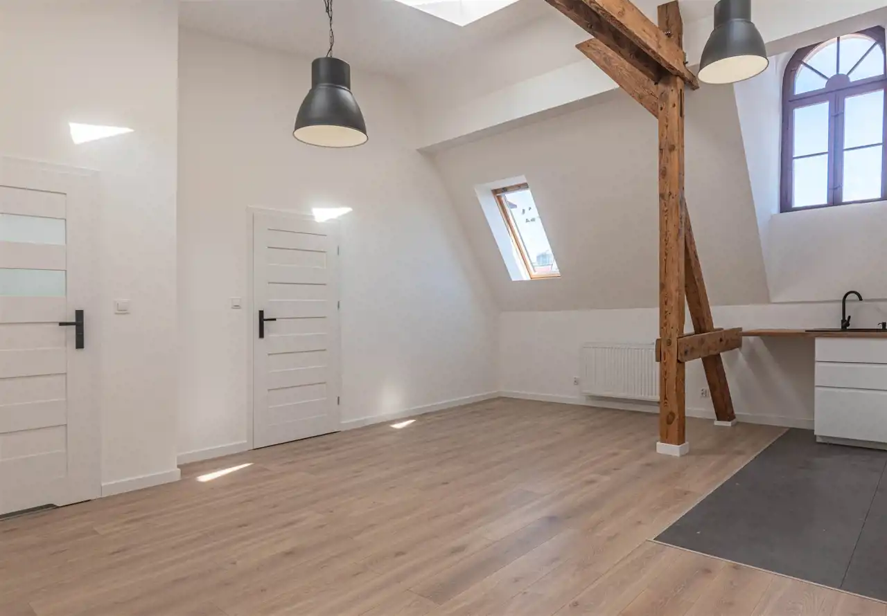 Adaptacja poddasza. Mieszkanie w bardzo dobrym standardzie, zaaranżowany w nowoczesnym stylu - salon otwarty na przedpokój, połączony z aneksem kuchennym, duża sypialnia. Łazienka połączona z wc. Ekspozycja okien jednostronna, północno wschodnia.