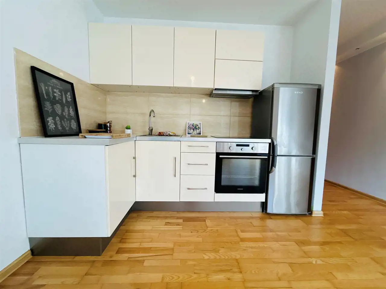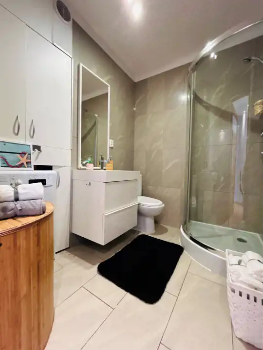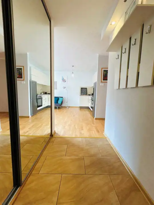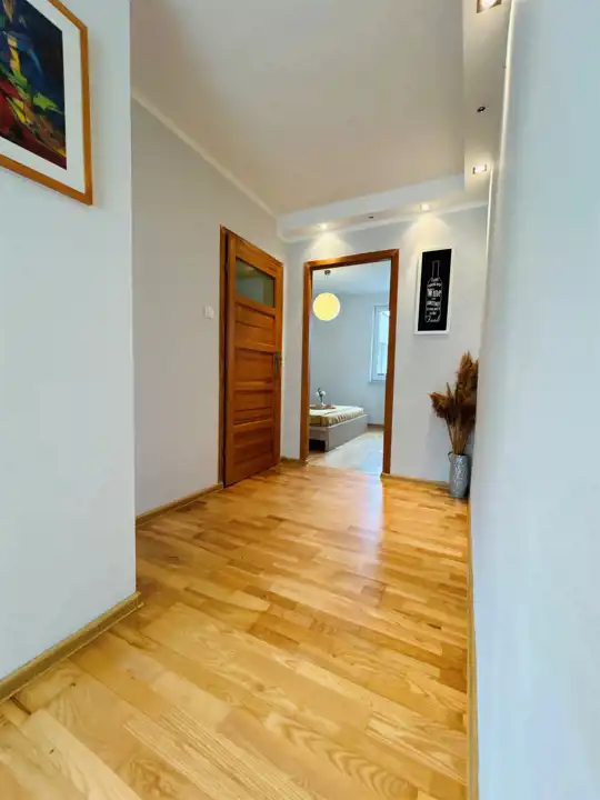 Mieszkanie składa się z salonu z aneksem kuchennym, sypialni, łazienki oraz dwóch korytarzy. W salonie znajduje się wyjście na duży, słoneczny balkon usytuowany od strony południowej z widokiem na las. W łazience zamontowano wygodną kabinę prysznicową oraz zabudowano pralkę. W kuchni znajdują się meble oraz niezbędne sprzęty w zabudowie. W korytarzu znajduje się duża szafa w zabudowie typu Komandor dająca miejsce do przechowywania. Ściany gładzone, malowane. Na podłogach panele drewniane, w łazience i korytarzu gres. Drzwi wewnętrzne drewniane, zewnętrzne antywłamaniowe. Ogrzewanie i ciepła woda pochodzą z pieca gazowego dwufunkcyjnego. Mieszkanie gotowe do wprowadzenia lub wynajmu - wszystkie meble i sprzęty widoczne na zdjęciach pozostają do dyspozycji nabywcy.