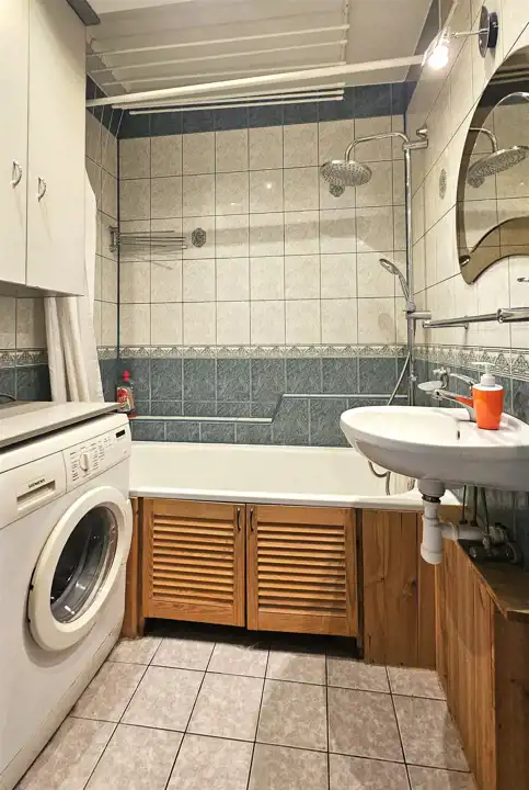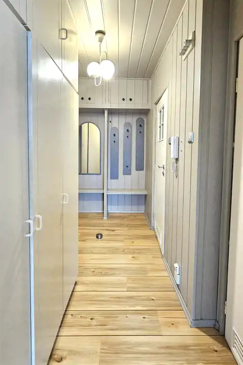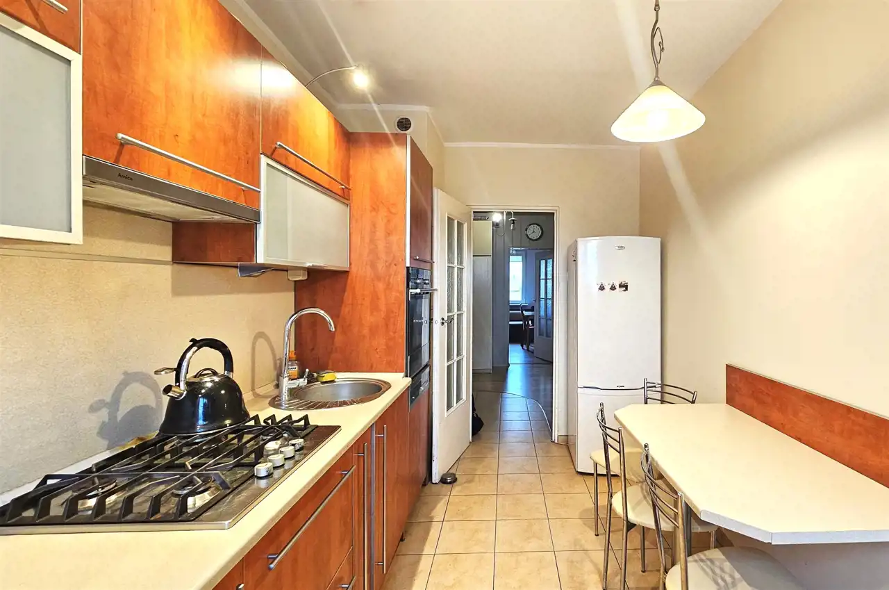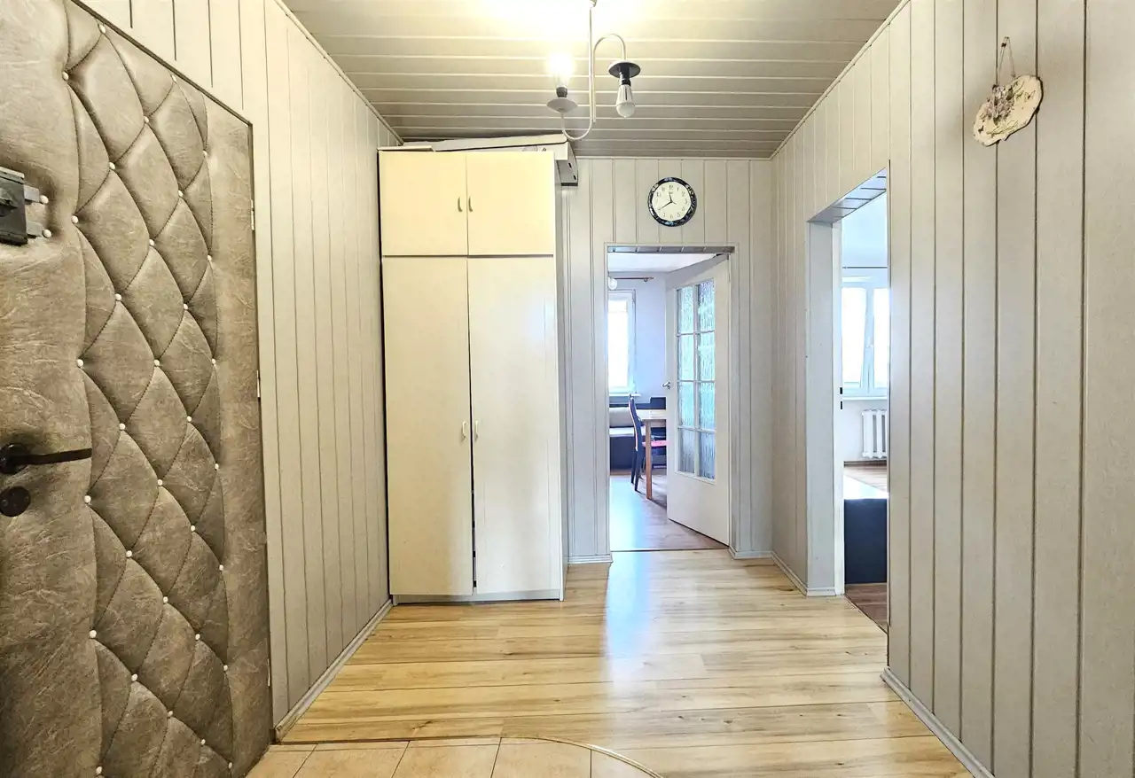 Składa się z trzech rozkładowych pokoi, oddzielnej kuchni z oknem, łazienki z wanną, WC z umywalką oraz dwóch korytarzy. Z salonu wyjście na balkon. Ogrzewanie i ciepła woda z sieci miejskiej. Mieszkanie słoneczne, środkowe. W pokojach na podłodze panele. W łazience, WC i kuchni kafle. Ściany gładzone malowane. Okna PCV. Do mieszkania przynależy piwnica. Dodatkowo w budynku jest dostępna suszarnia oraz wózkowania.