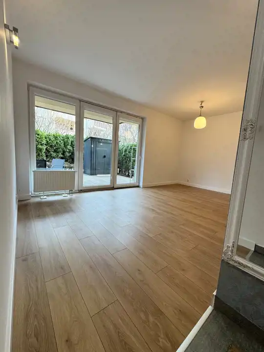 Z salonu prowadzi bezpośrednie wyjście na taras oraz prywatny ogródek, co tworzy idealne miejsce do relaksu, porannej kawy czy spotkań z rodziną i przyjaciółmi.