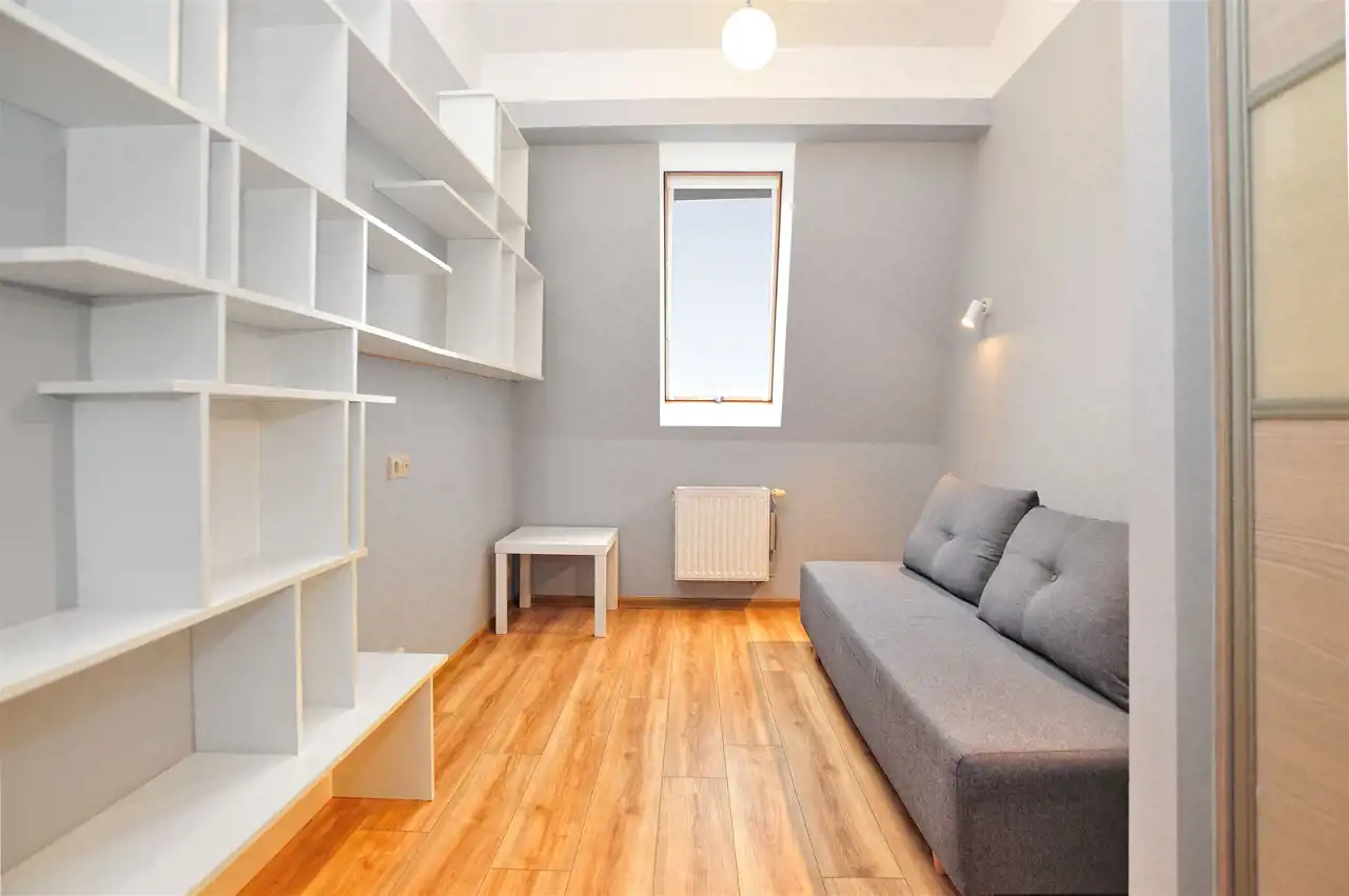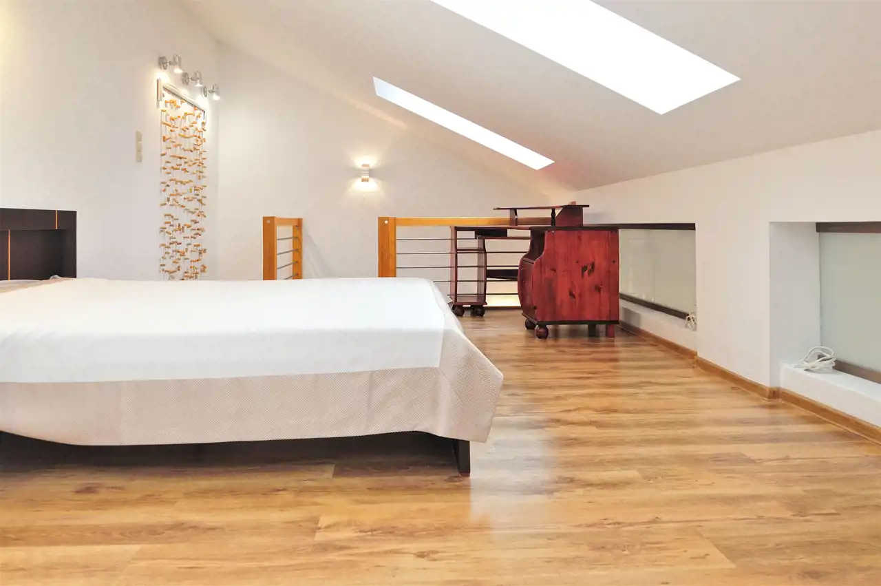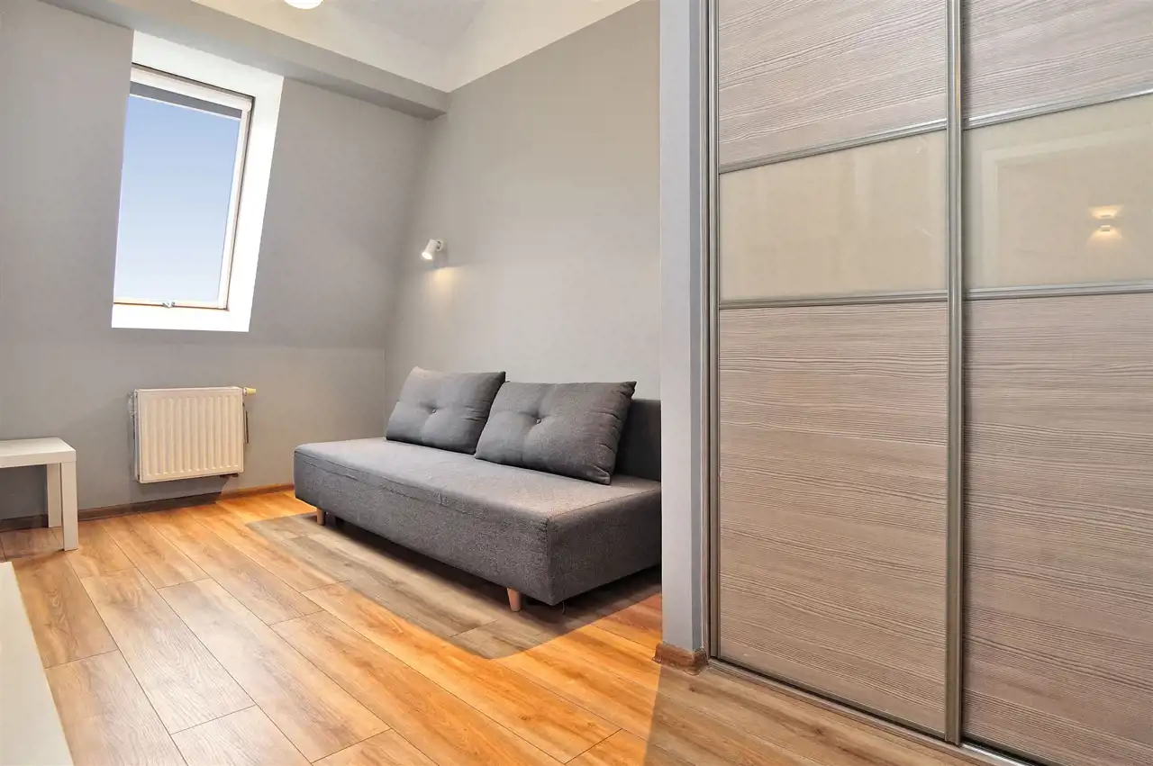 - Antresolę z ustawnym pokojem, idealnym na sypialnię, pokój dziecka, gabinet lub strefę pracy.
