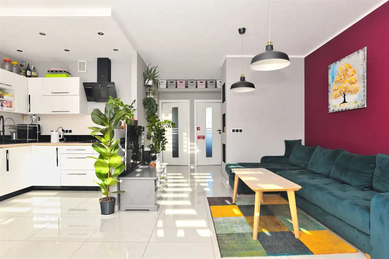 - Przestronny salon z otwartą kuchnią (29,3 m²) - wraz z wyjściem na balkon.