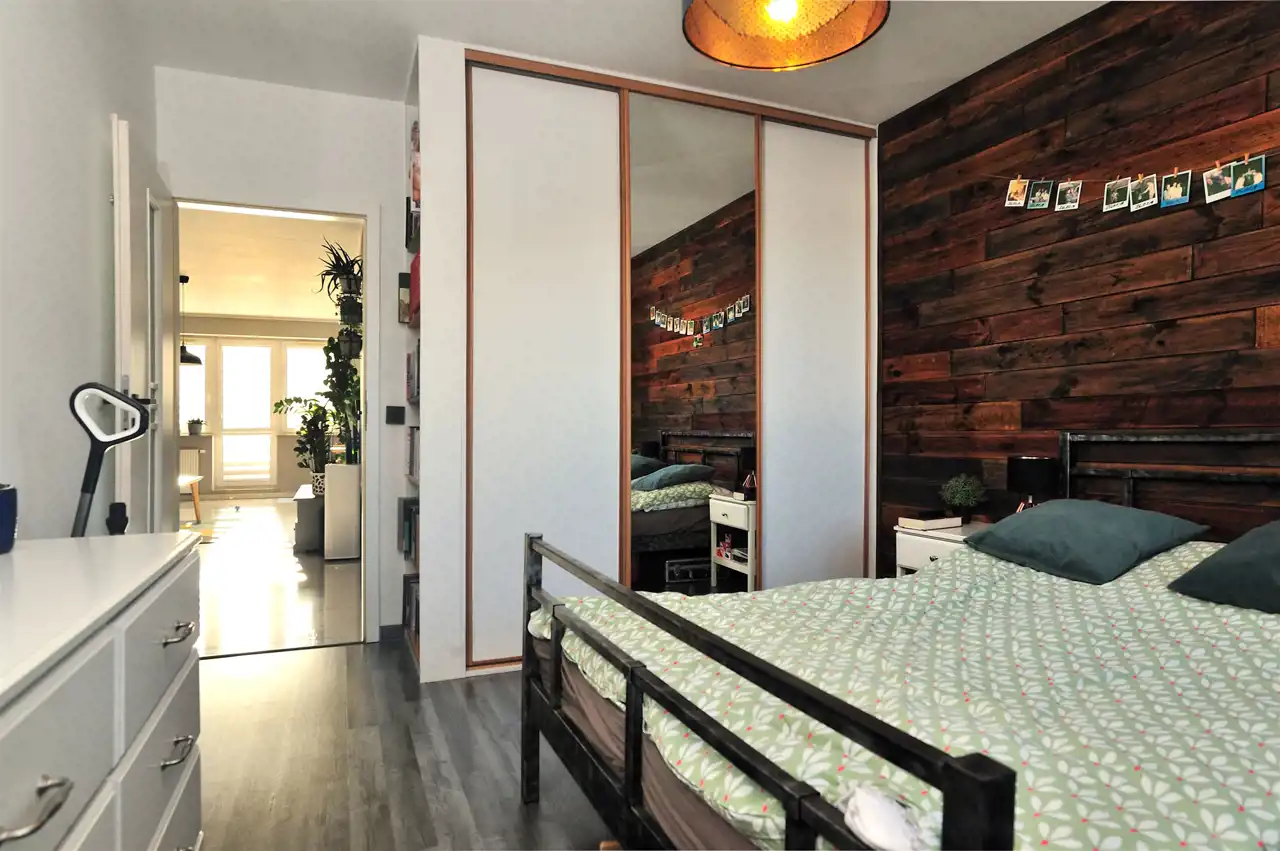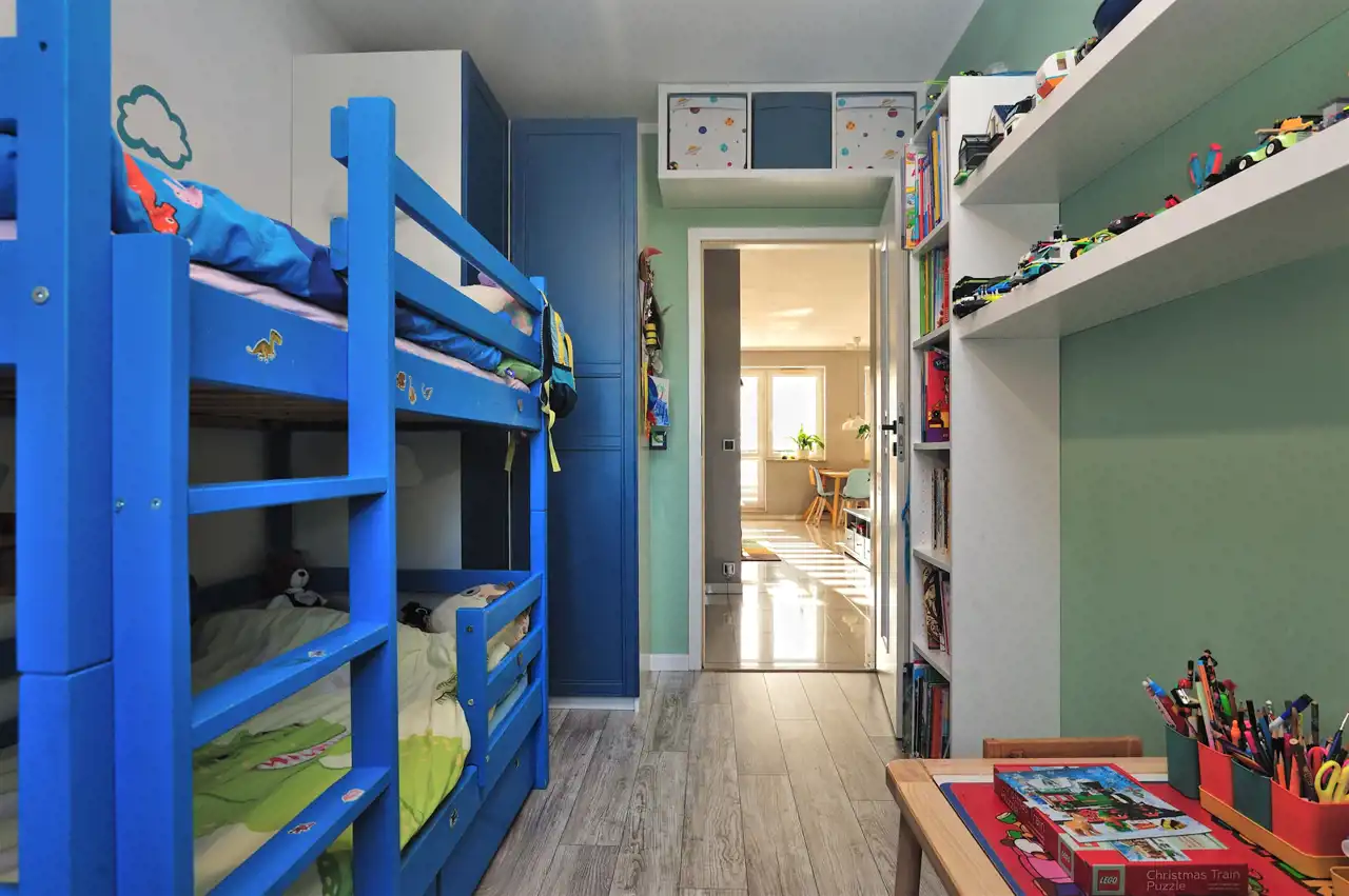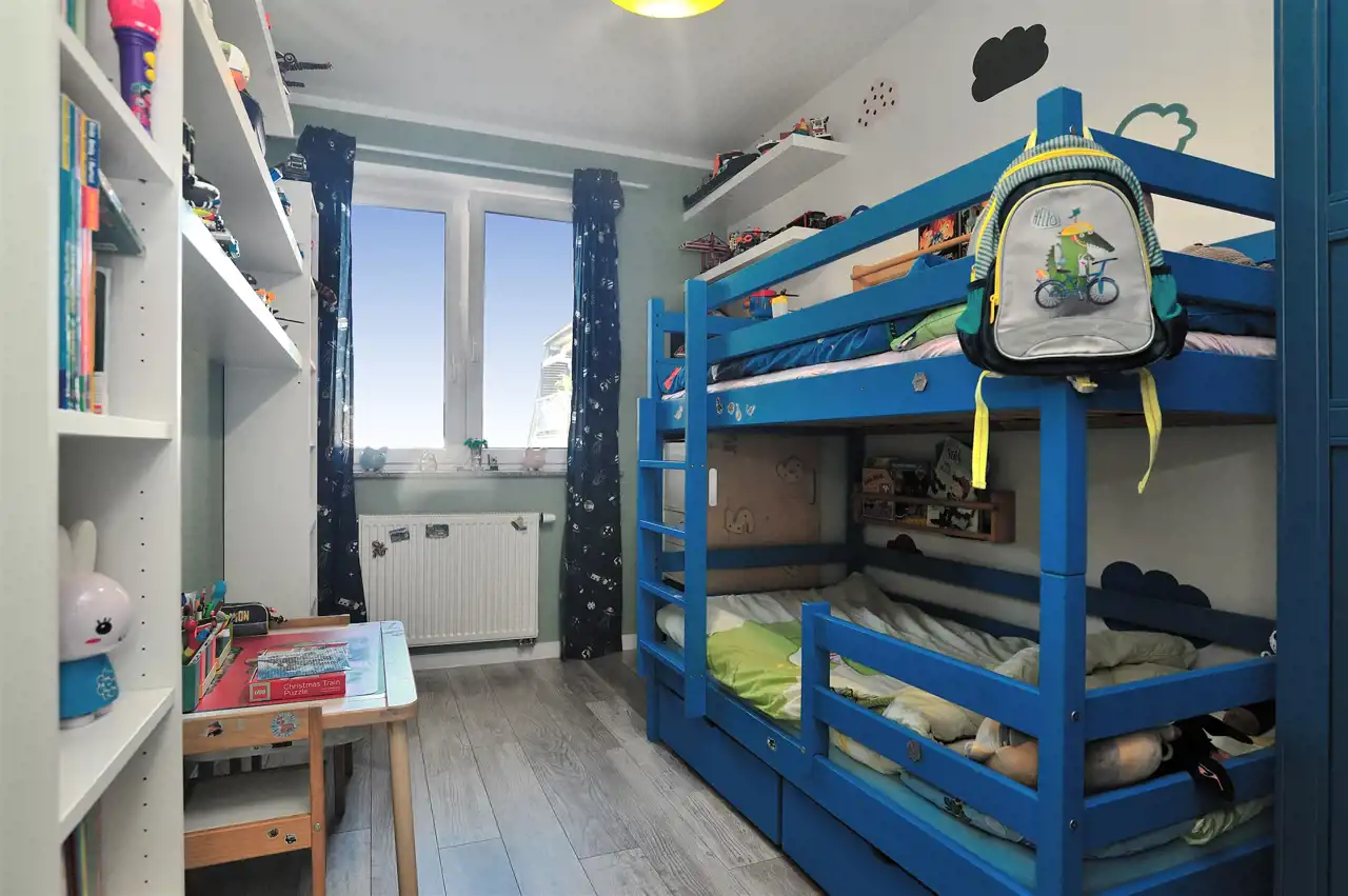 - Dwa pokoje (13,6 m² i 9,6 m²) - zlokalizowane z północnej części mieszkania, w pierwszym z pokojów znajduje się duża szafa zrobiona na wymiar wraz z małą biblioteczką na książki. W pokoju dziecięcym natomiast znajduje się szafa narożna PAX z Ikei. Wejście do pokoi bezpośrednio z przedpokoju.