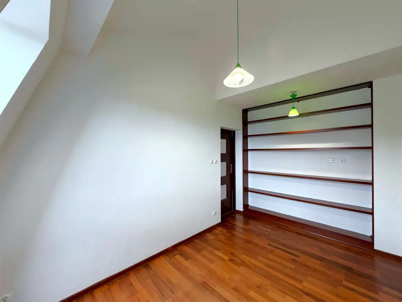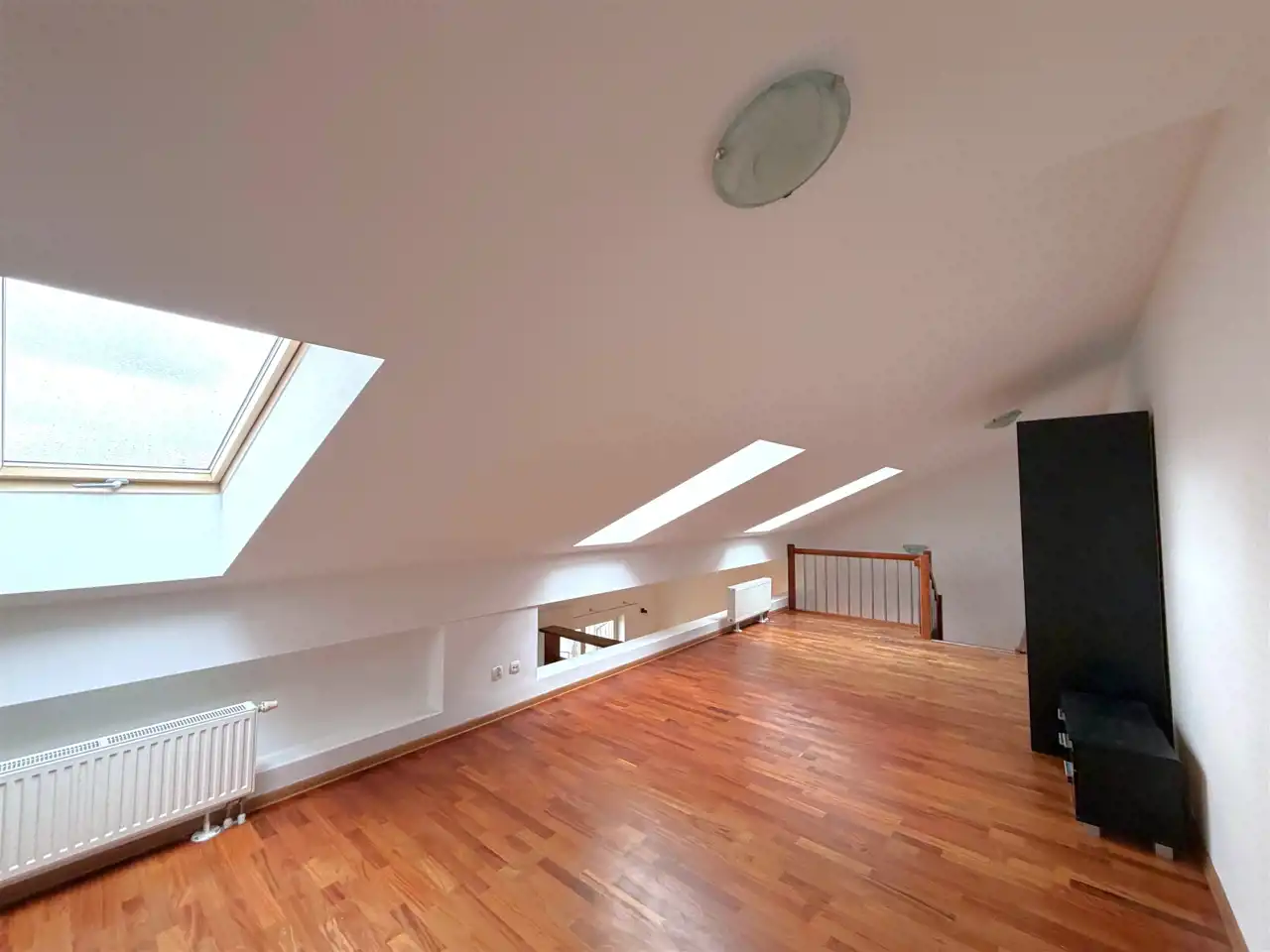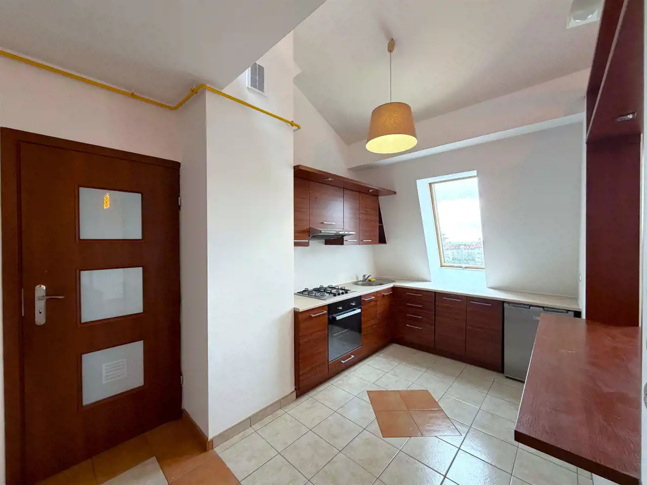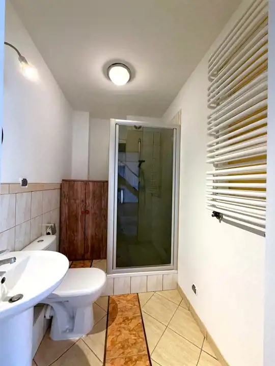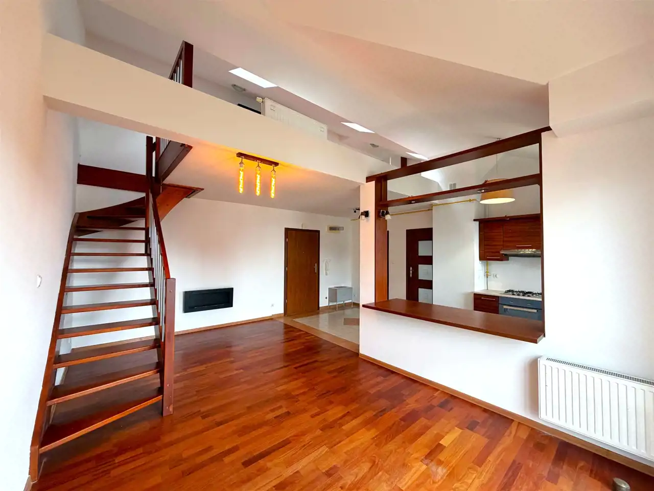 Lokal składa się z: holu, łazienki z kabiną prysznicową wraz z WC, otwartej widnej kuchni z oknem, sypialni, salonu z bezpośrednim wyjściem na balkon, który daje nam możliwość podziwiania stawu wodnego. Na piętro udamy się drewnianymi schodami, a tam znajduję się antresola do własnej aranżacji, która w tym momencie pełni funkcję jednego dużego pokoju z aneksem kuchennym oraz kolejną łazienką, w której z kolei znajduję się wanna, pralka oraz toaleta. Jest to idealne rozwiązanie z racji dwóch niezależnych łazienek.