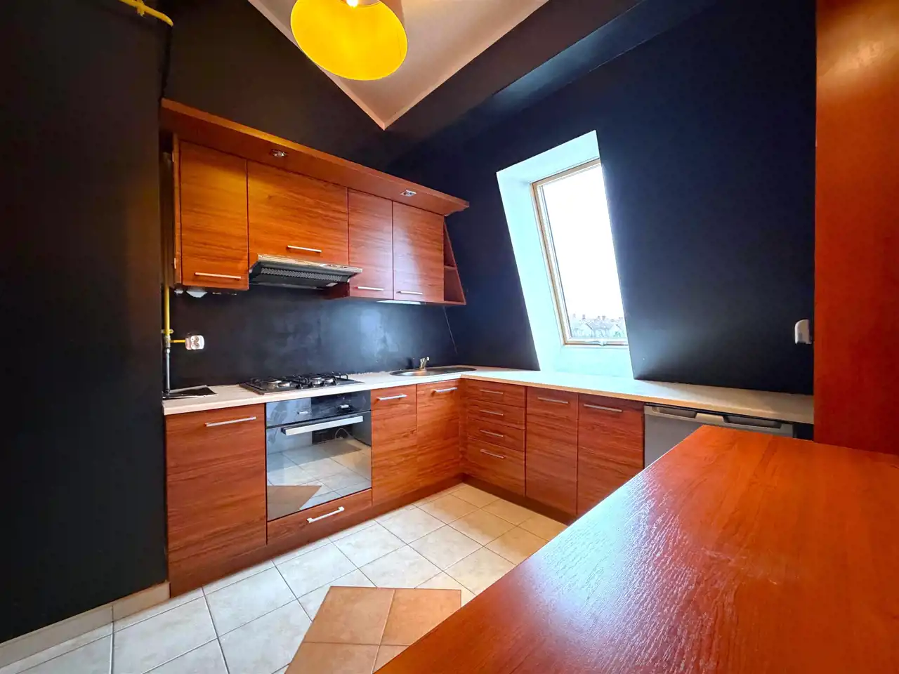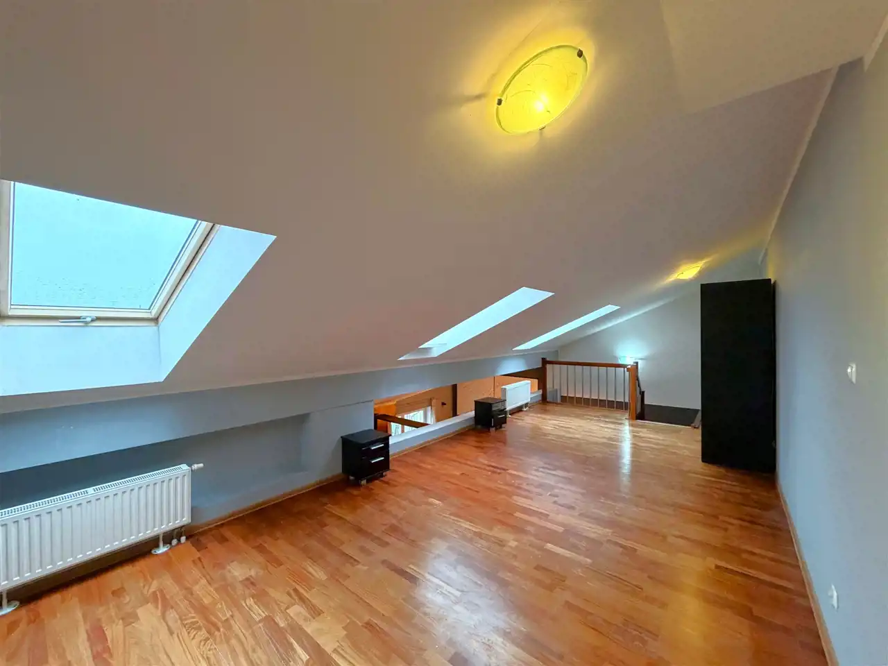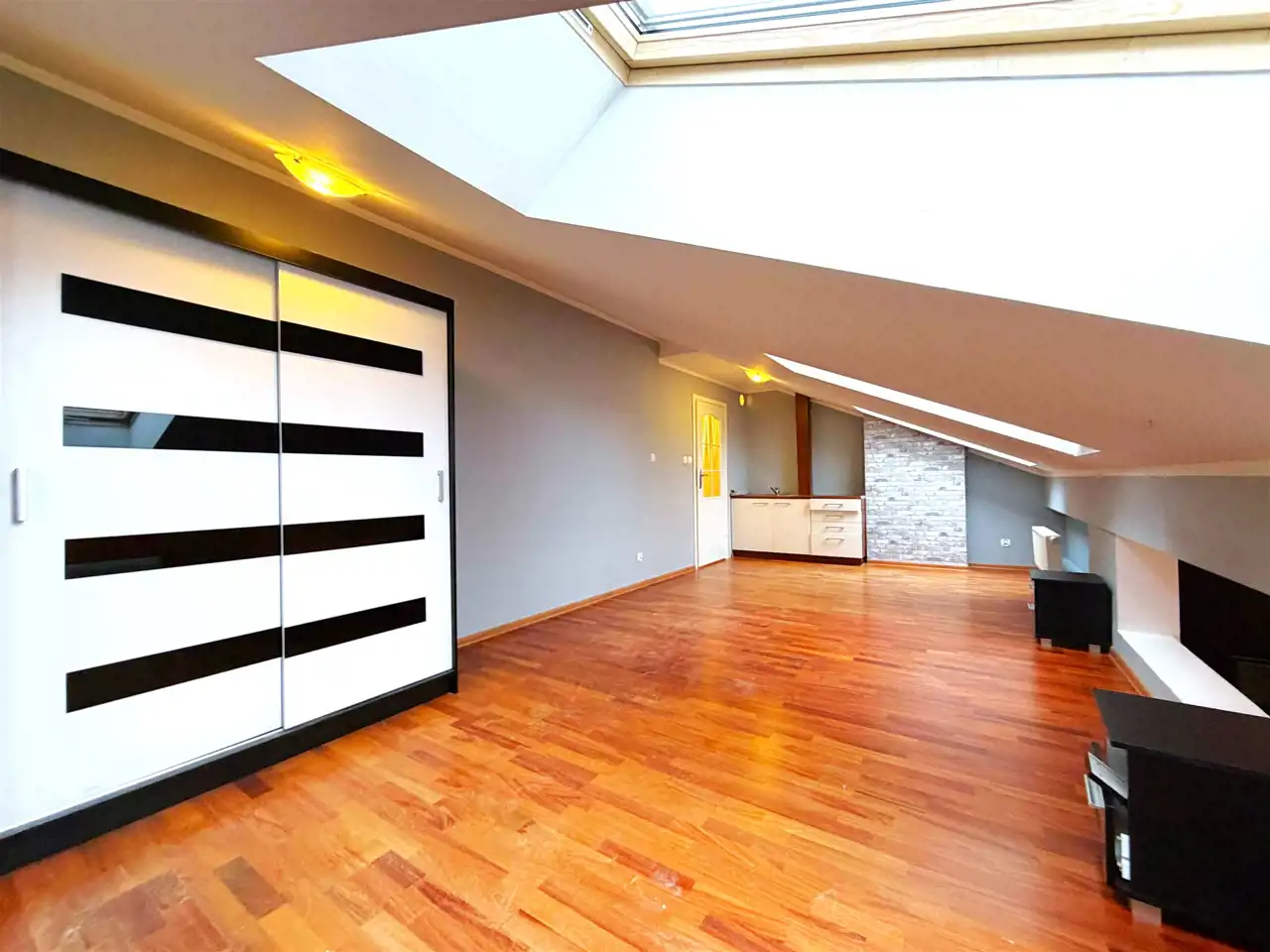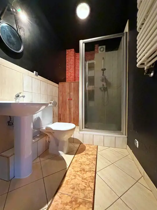 Lokal składa się z: holu, łazienki z kabiną prysznicową wraz z WC, otwartej widnej kuchni z oknem, sypialni, salonu z bezpośrednim wyjściem na balkon, który daje nam możliwość podziwiania stawu wodnego. Na piętro udamy się drewnianymi schodami, a tam znajduję się antresola do własnej aranżacji, która w tym momencie pełni funkcję jednego dużego pokoju z aneksem kuchennym oraz kolejną łazienką, w której z kolei znajduję się wanna, pralka oraz toaleta. Jest to idealne rozwiązanie z racji dwóch niezależnych łazienek.
